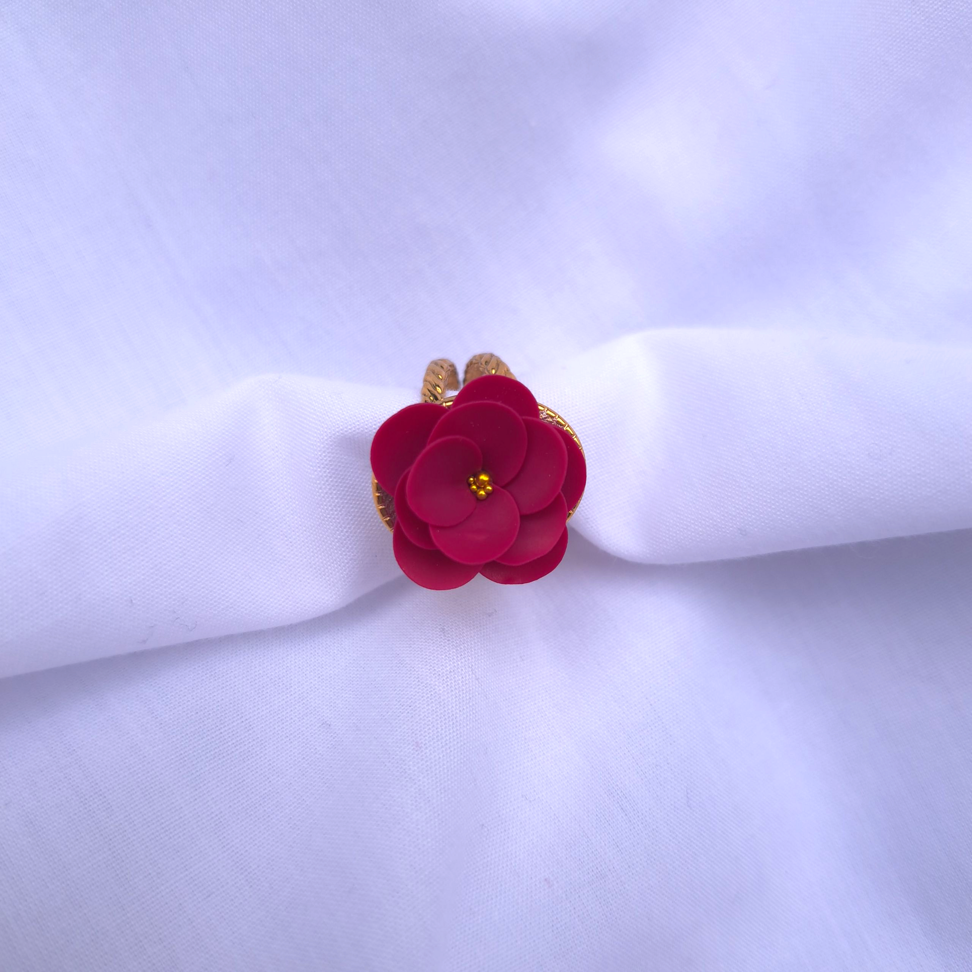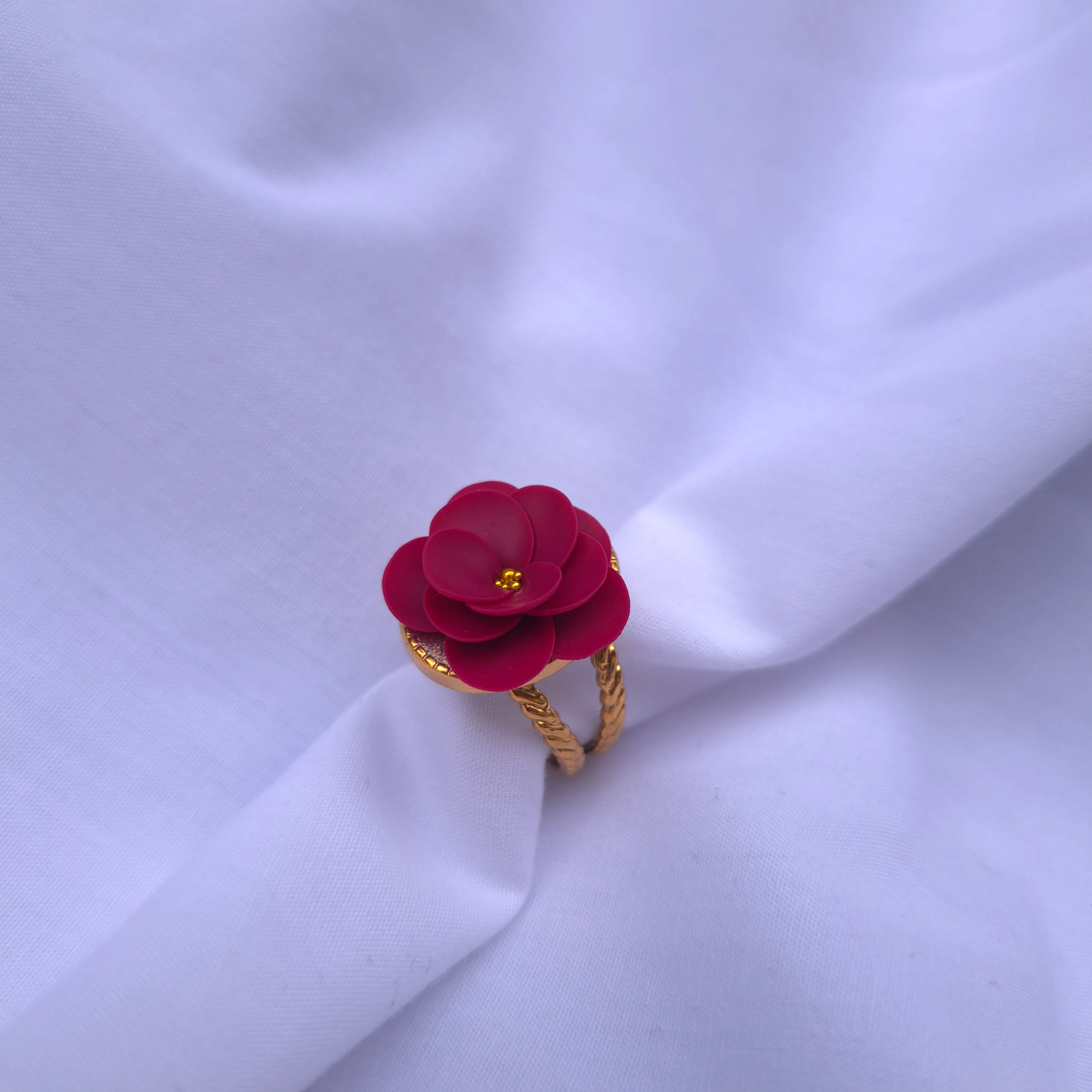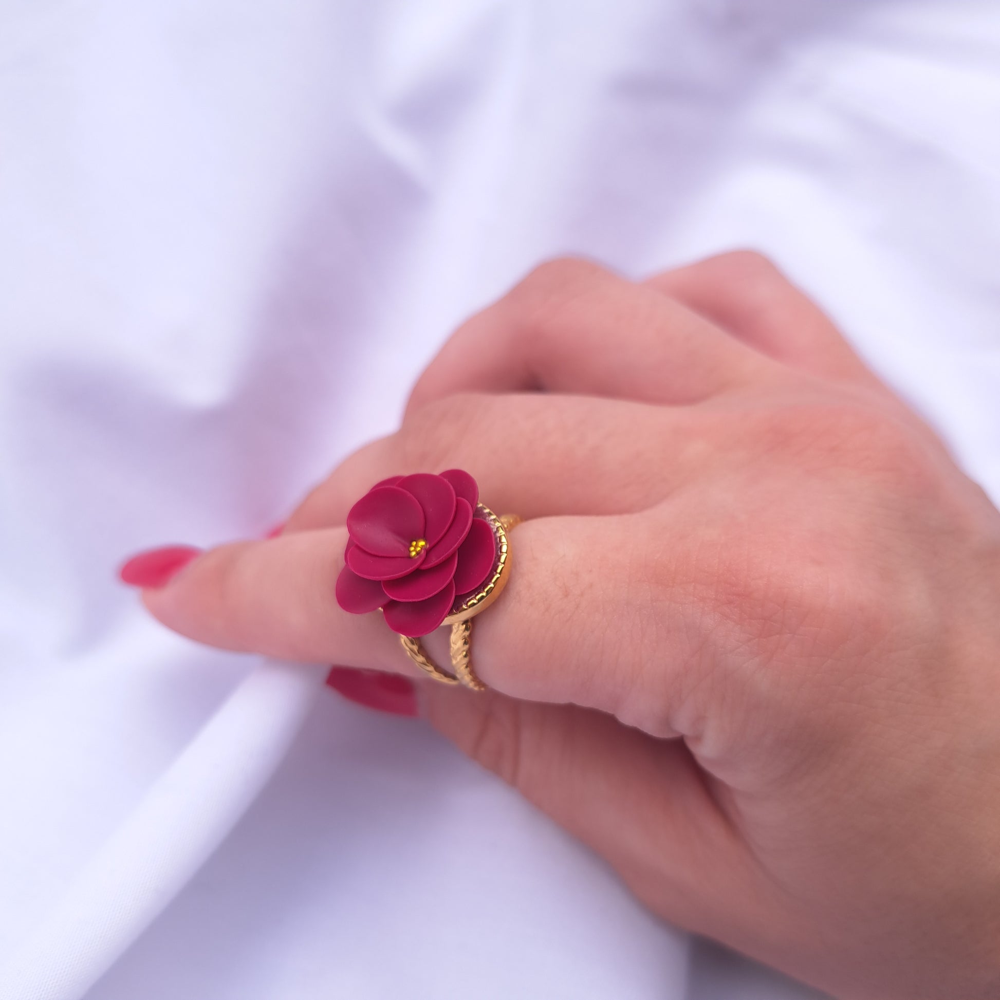 Un anello che incanta con la sua delicata eleganza: Fiore di Rubino è realizzato con una base placcata in oro 18k e impreziosito da un fiore artigianale nei toni del fucsia intenso, ispirato alla sensualità della camelia. Perfetto per completare il set con i tuoi gioielli floreali, aggiunge un tocco romantico e sofisticato a ogni gesto.