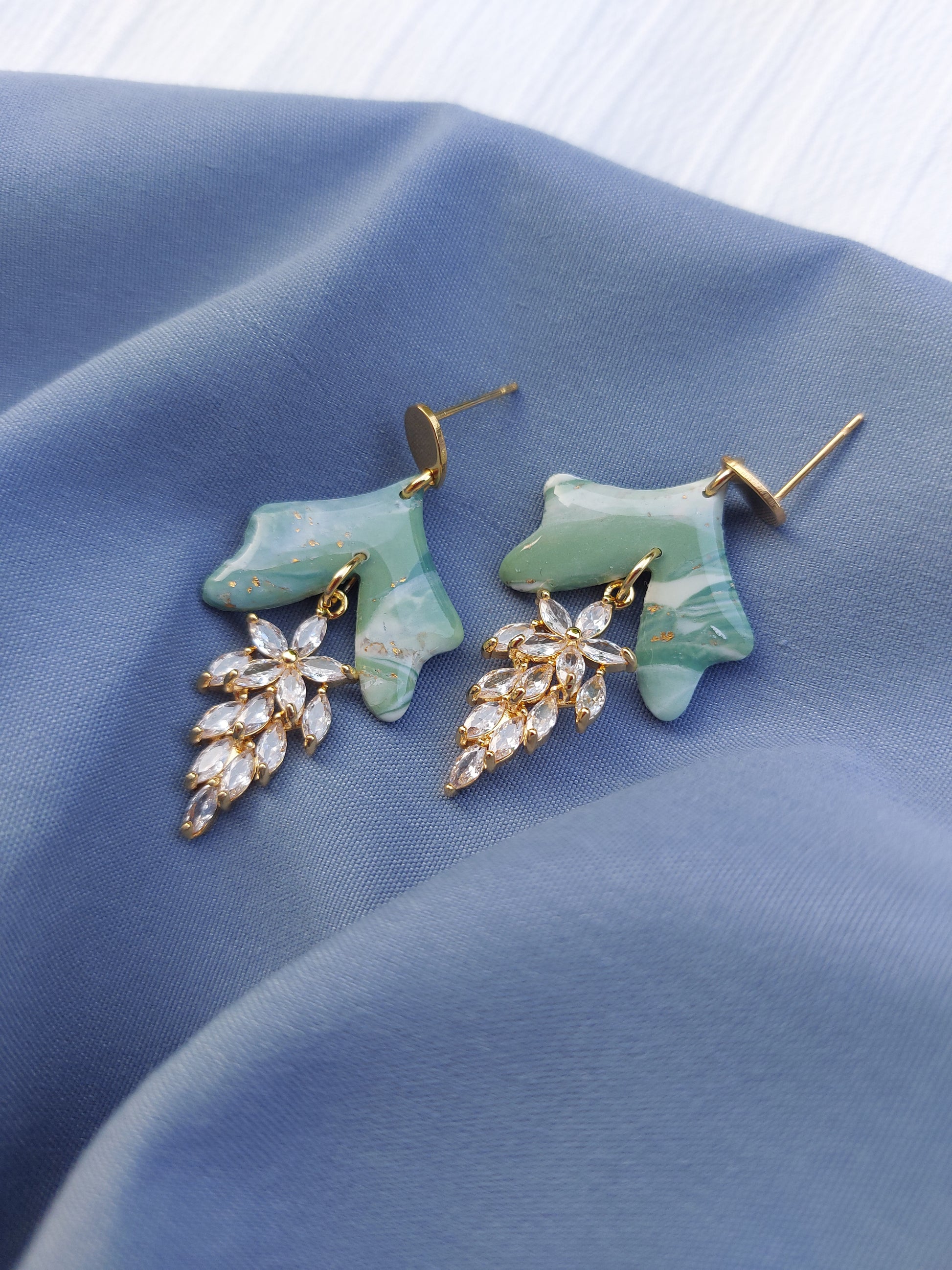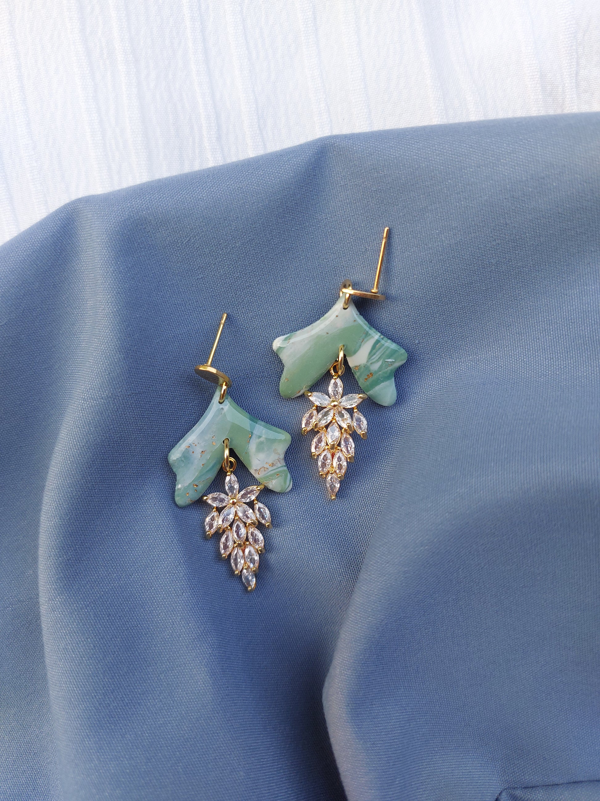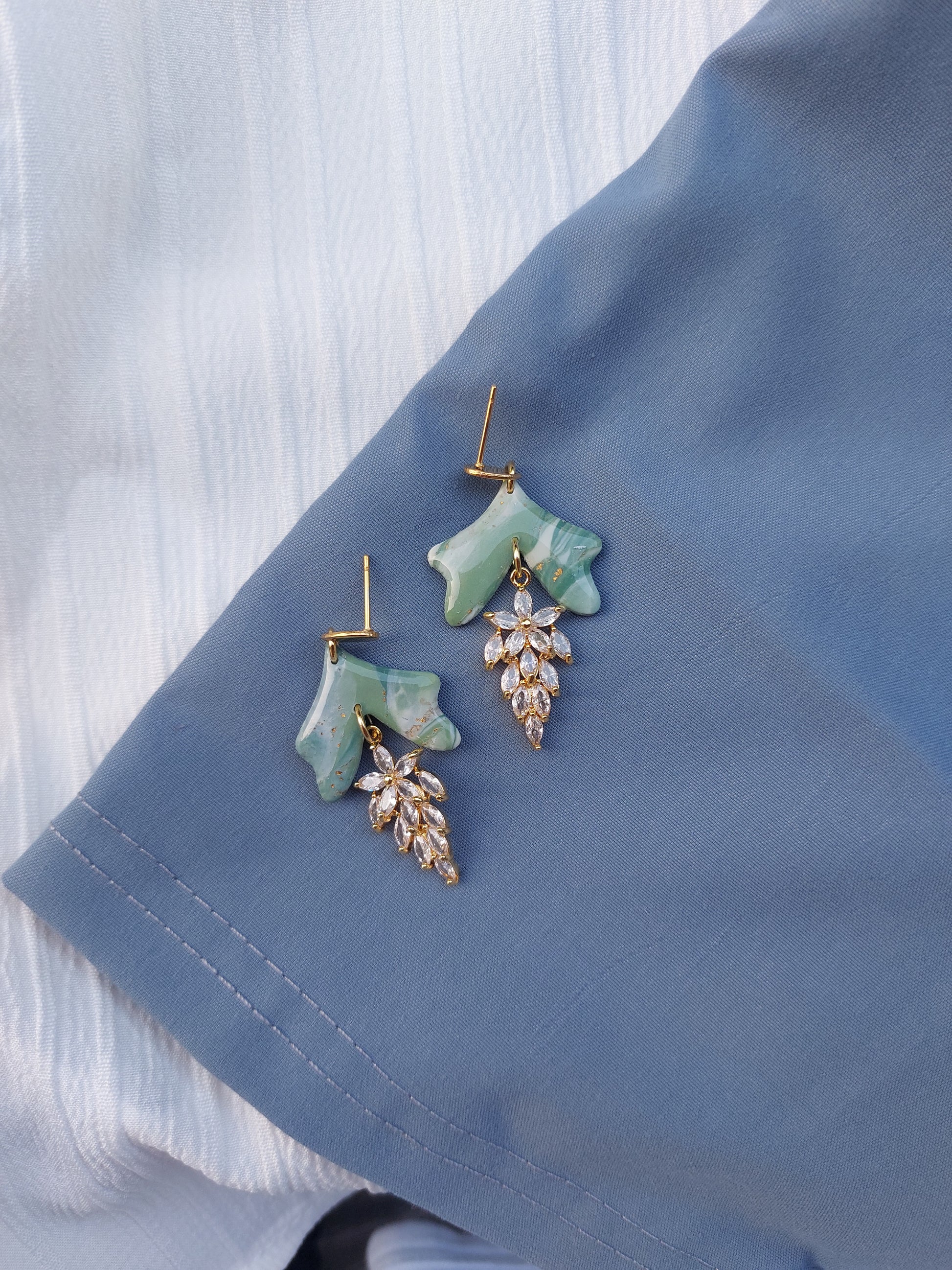 Ispirati alla bellezza eterna della giada, simbolo di armonia e saggezza, gli orecchini Gocce di Giada uniscono la forza della pietra alla leggerezza della forma. Le parti superiori in pasta polimerica verde marmorizzata evocano la texture naturale della giada, con venature uniche e riflessi dorati.