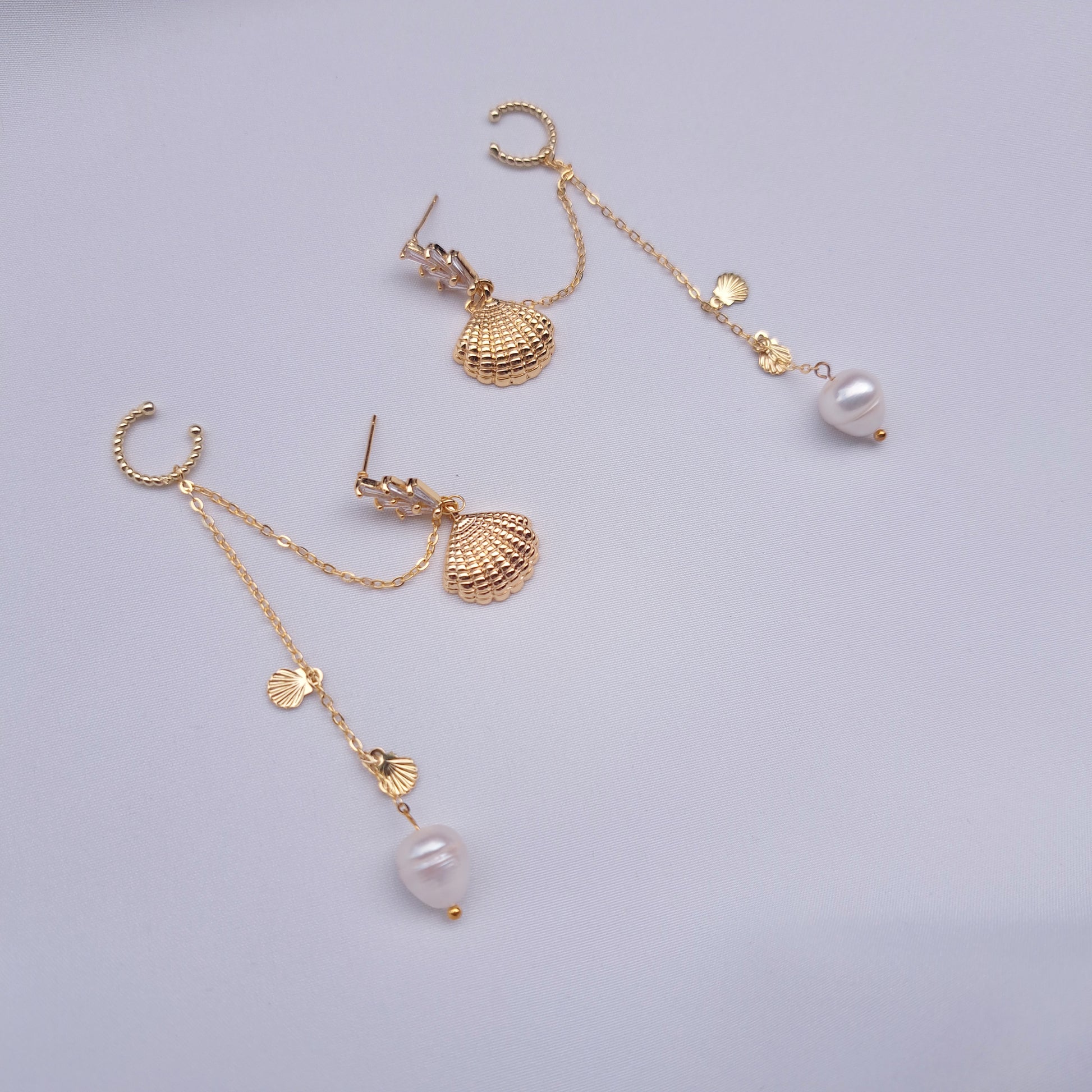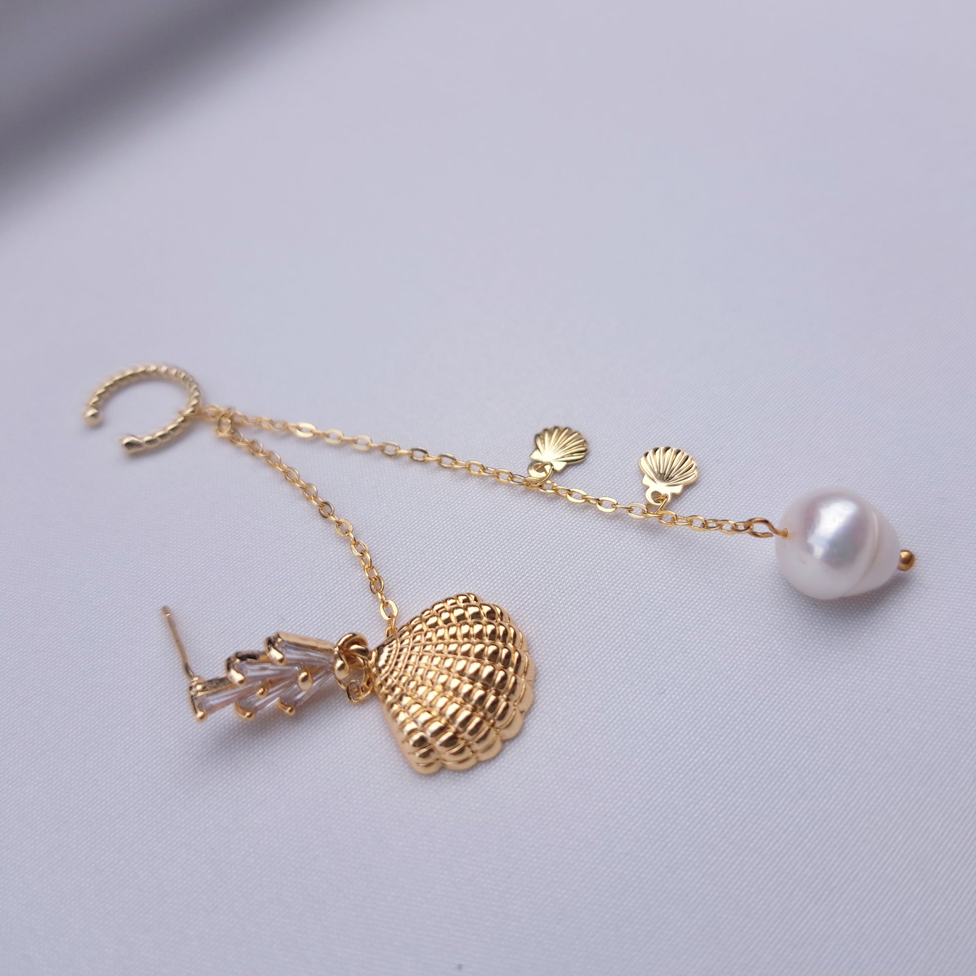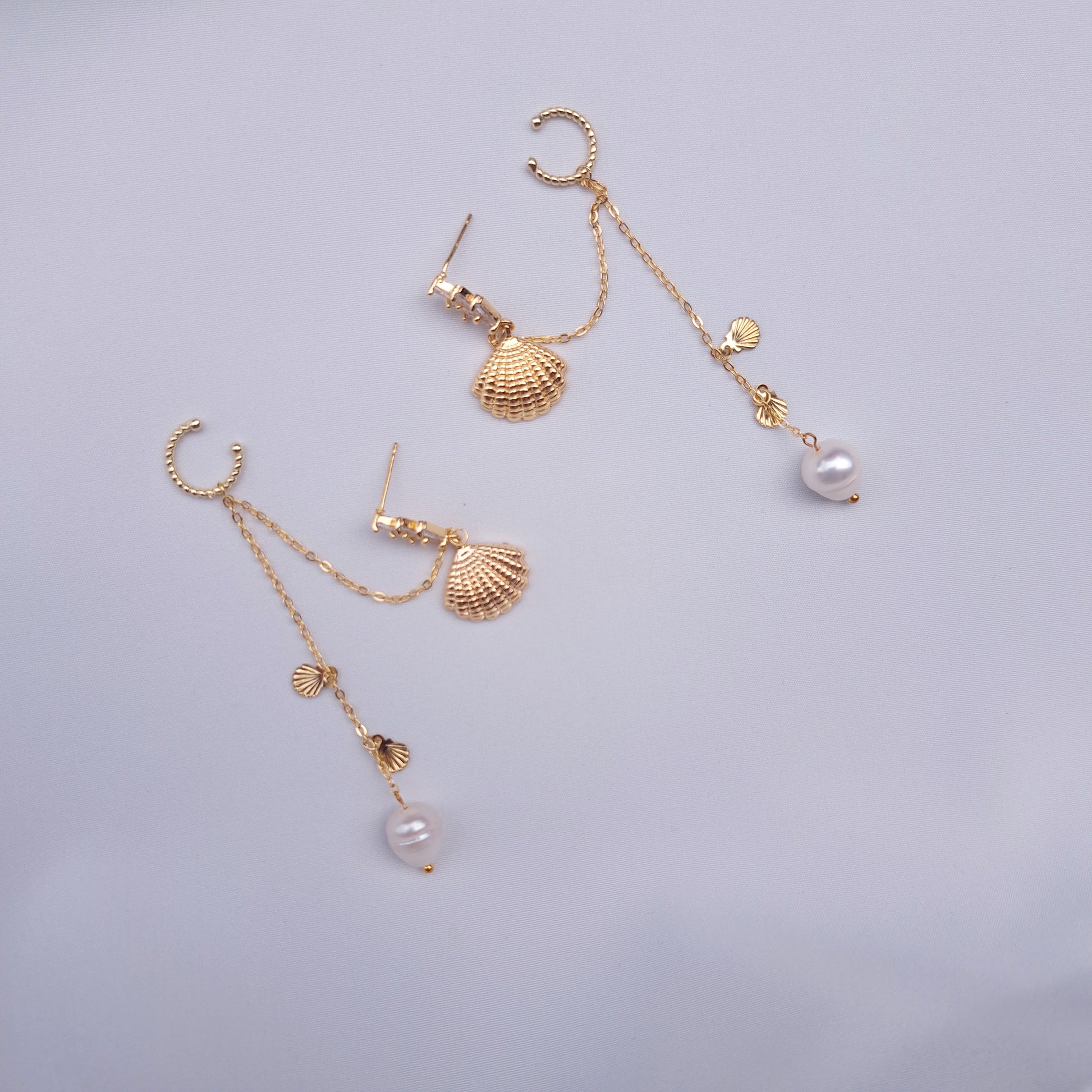 Un ear cuff con catena dorata, mini conchiglie pendenti e una perla d’acqua dolce che ricorda una goccia di mare.