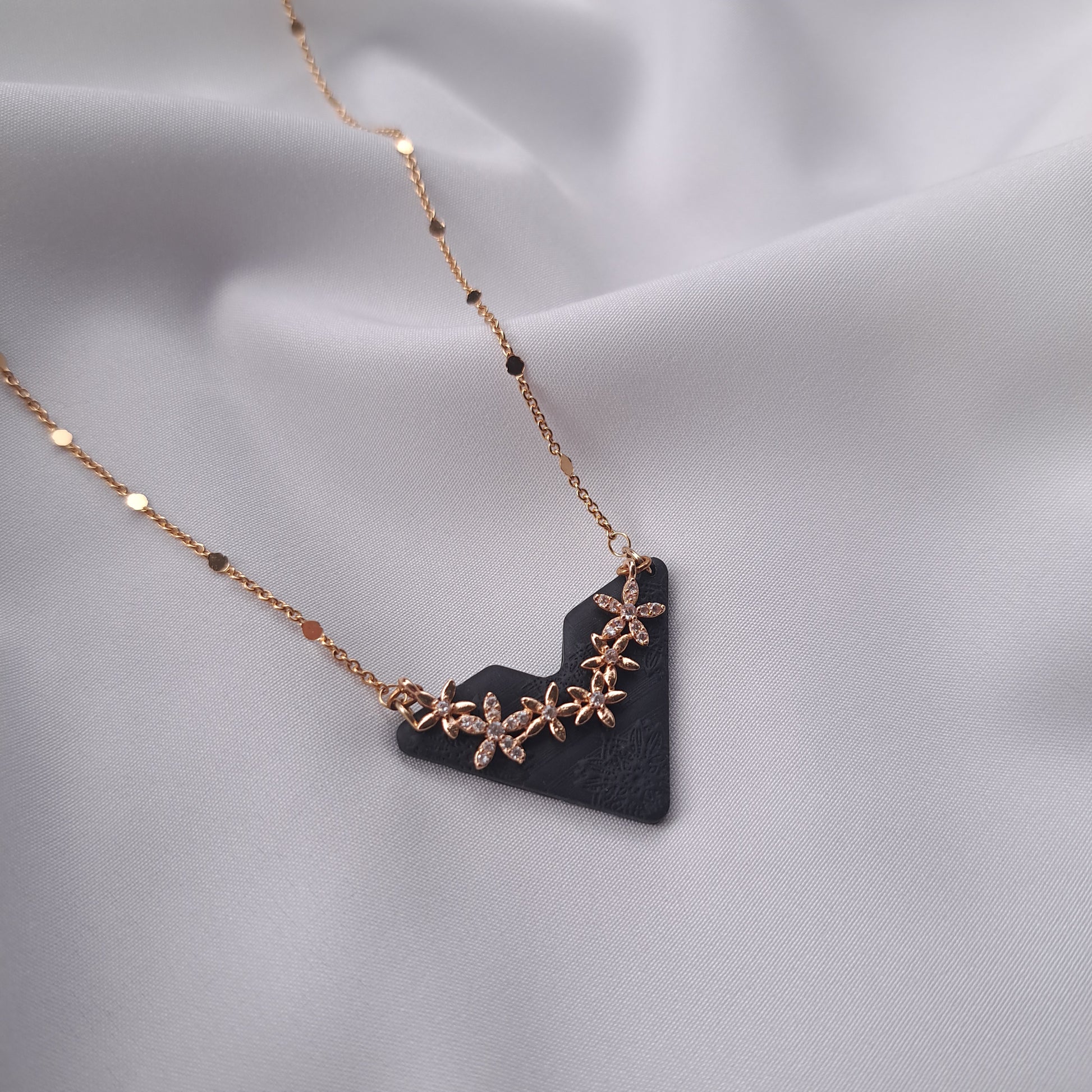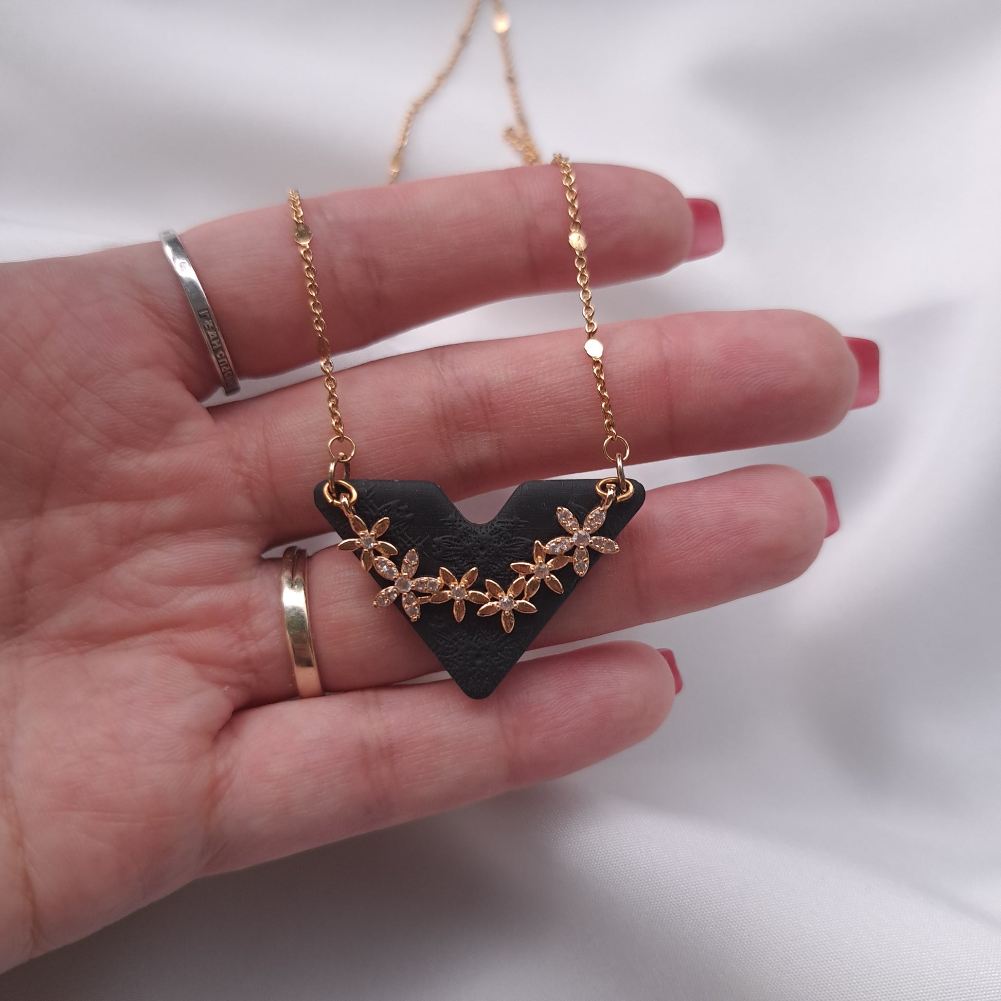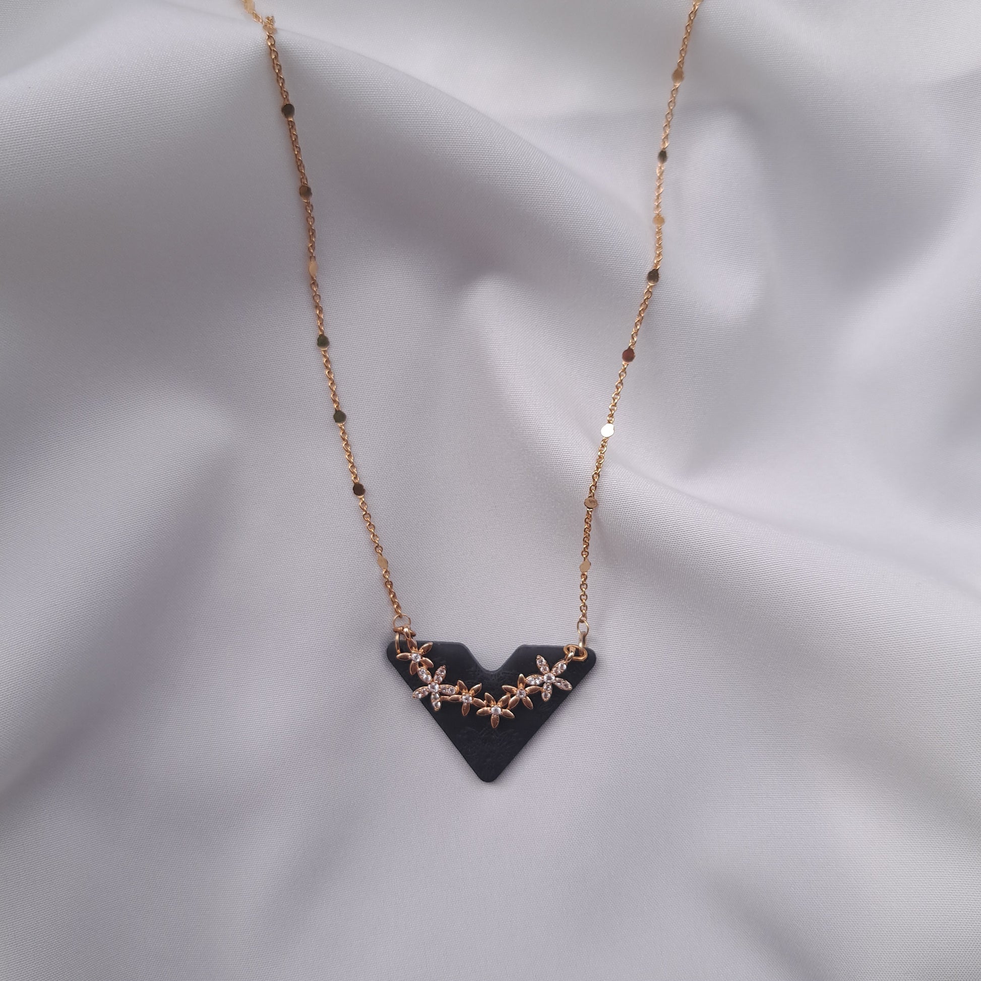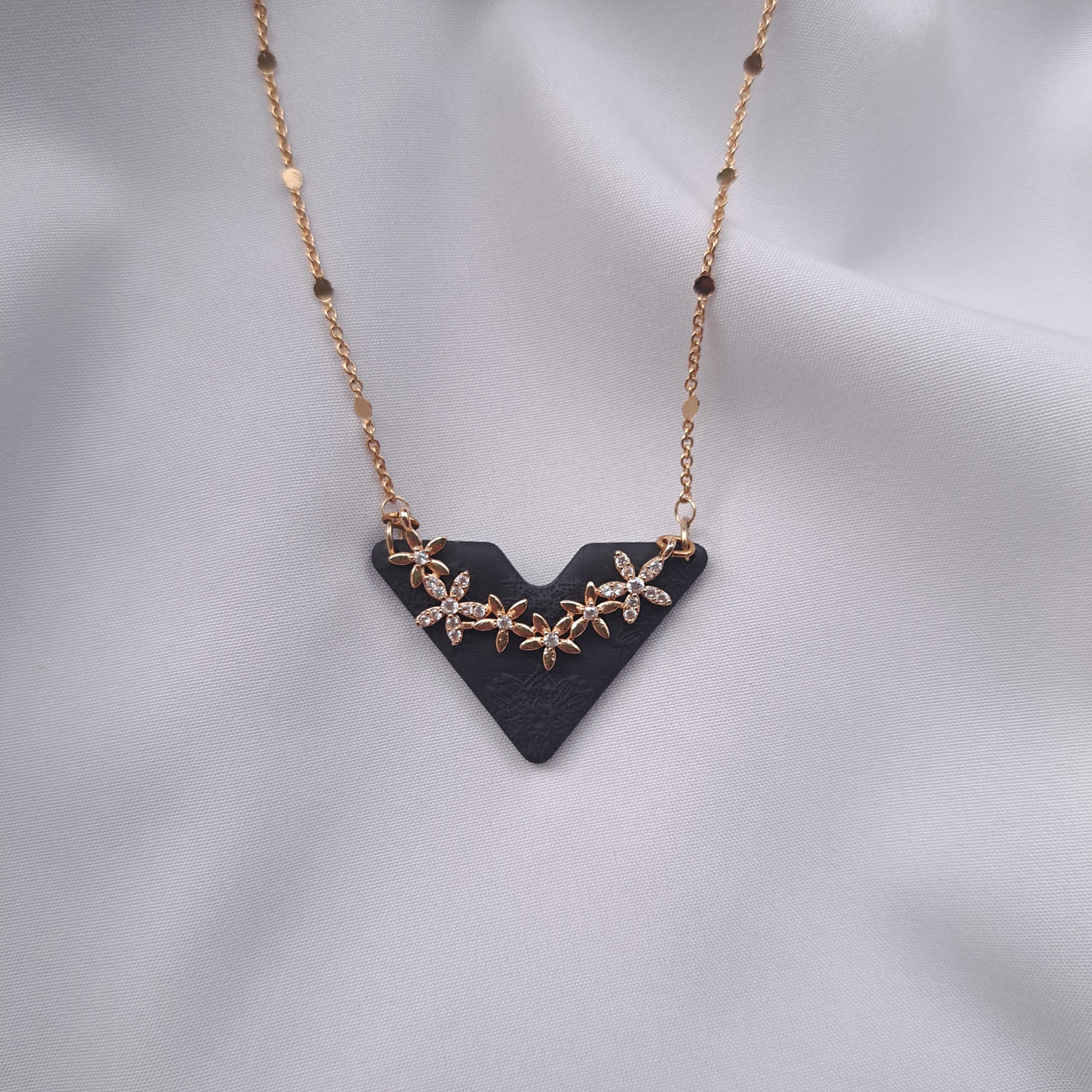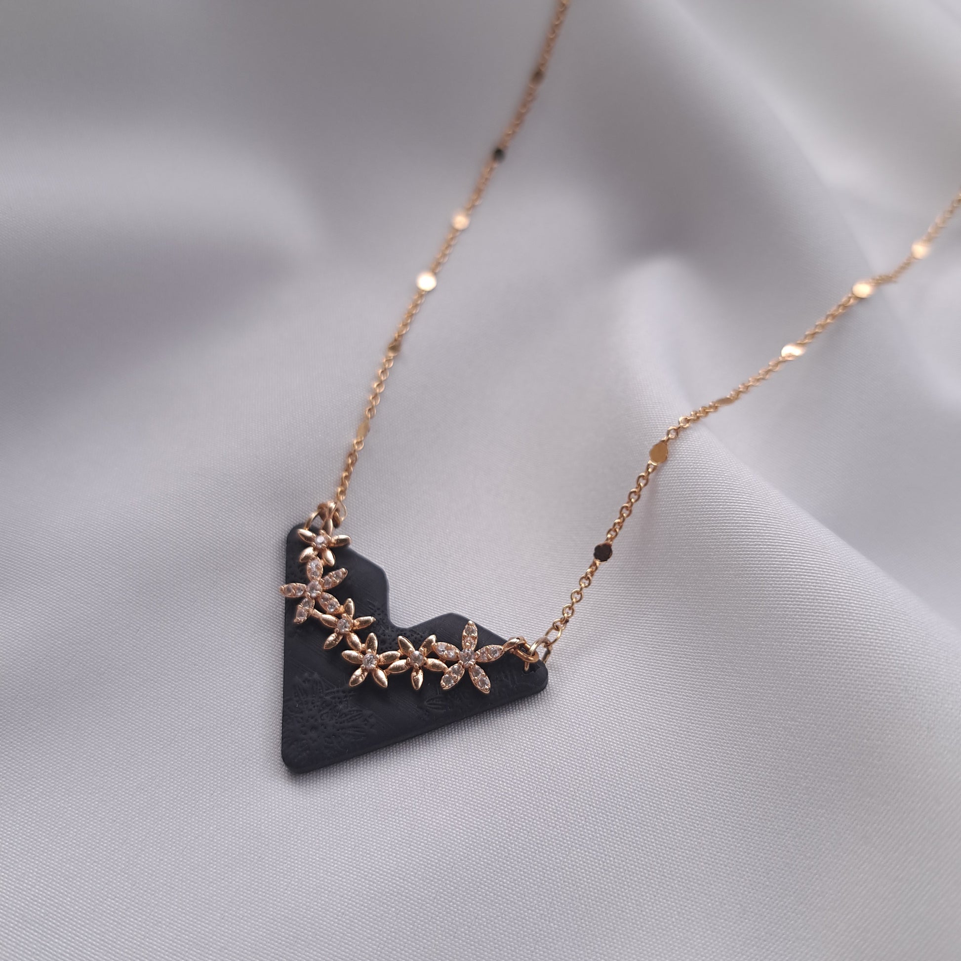 Notte Fiorita è una collana che unisce eleganza e mistero. Il pendente nero con i ricami in rilievo, dalle linee decise, si arricchisce di una delicata composizione floreale impreziosita da zirconi luminosi, creando un raffinato contrasto. La catena placcata oro 18k aggiunge un tocco di calore e raffinatezza.