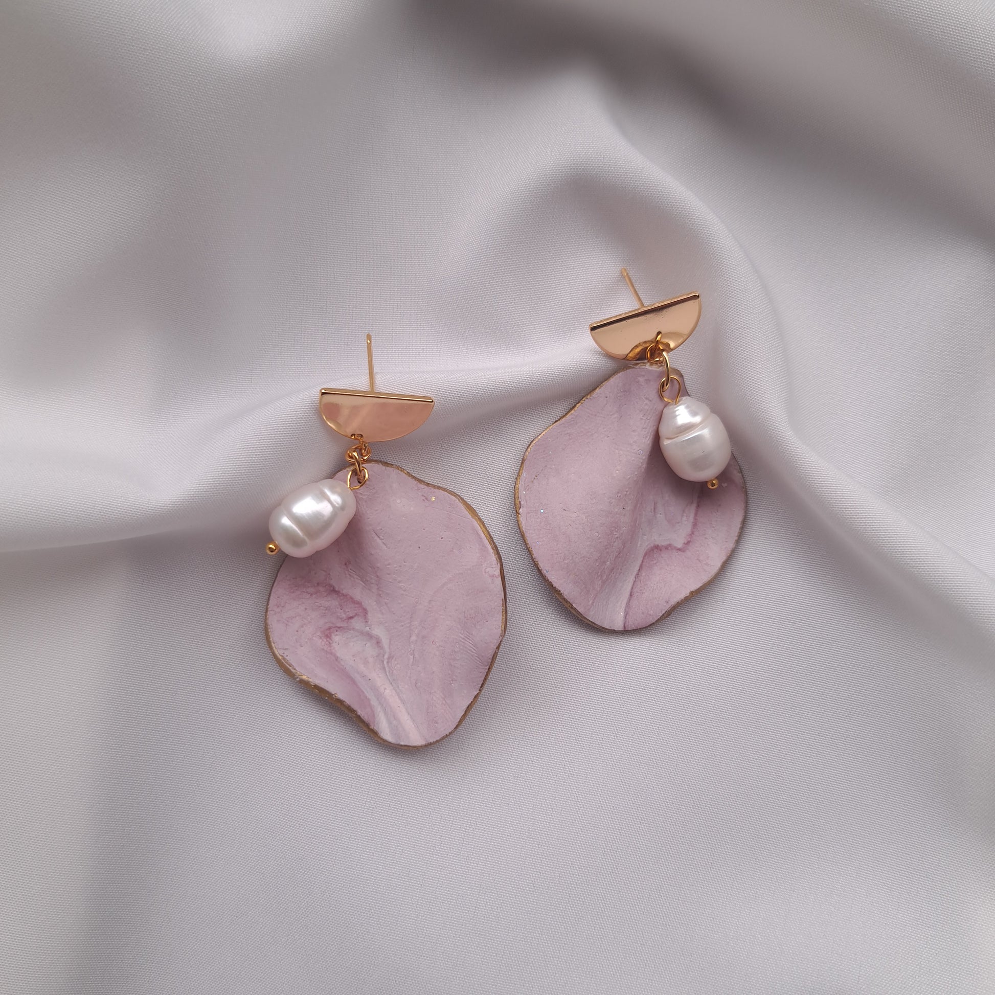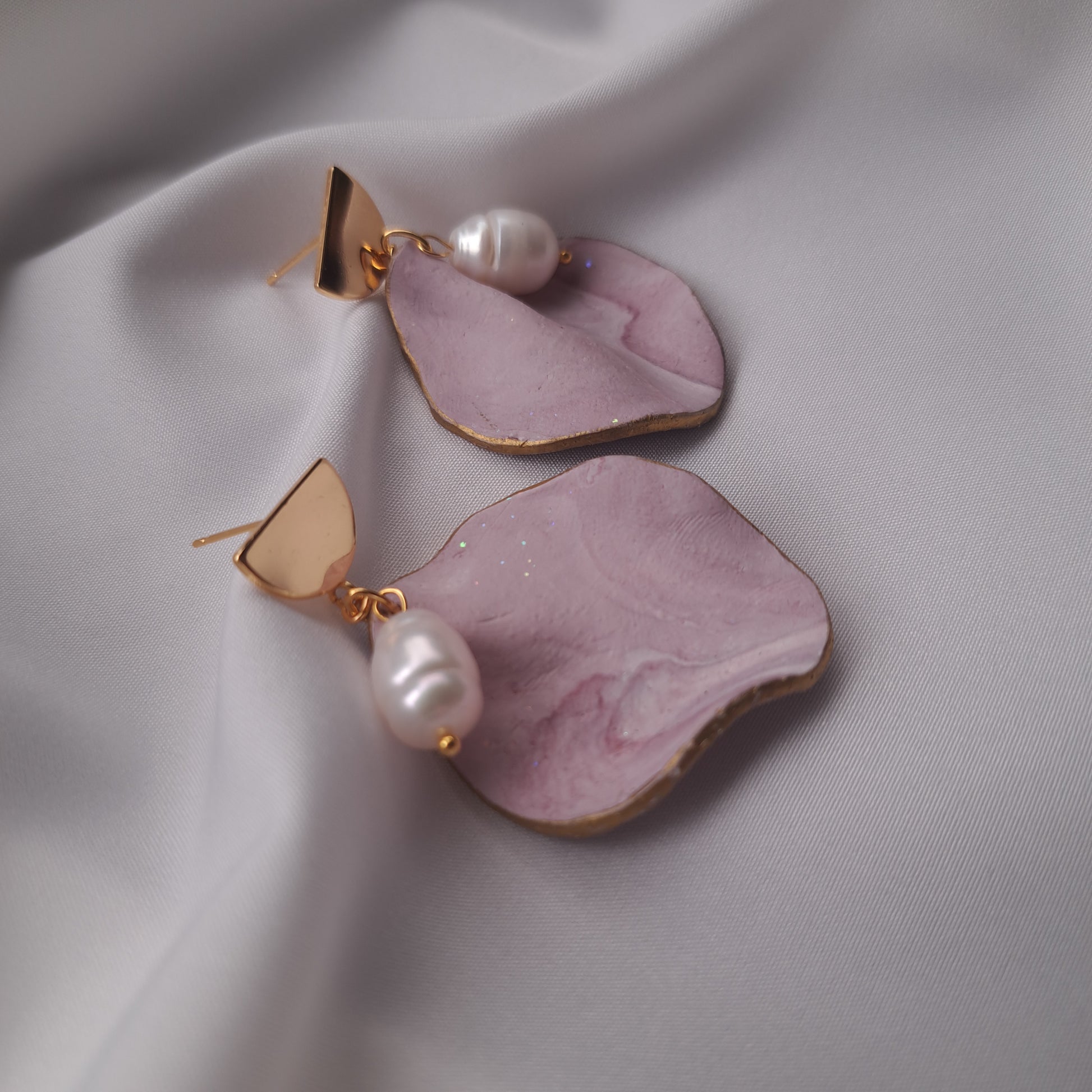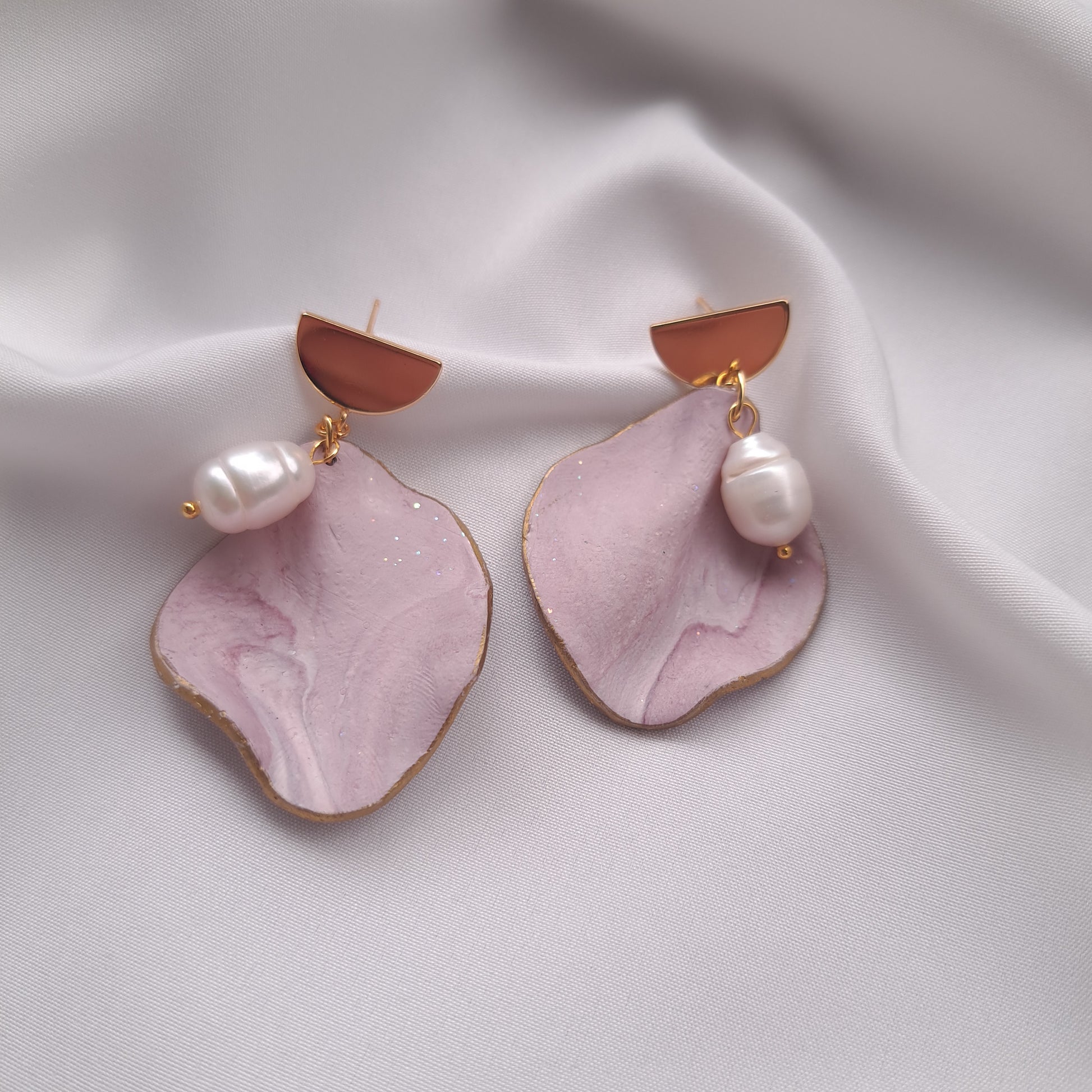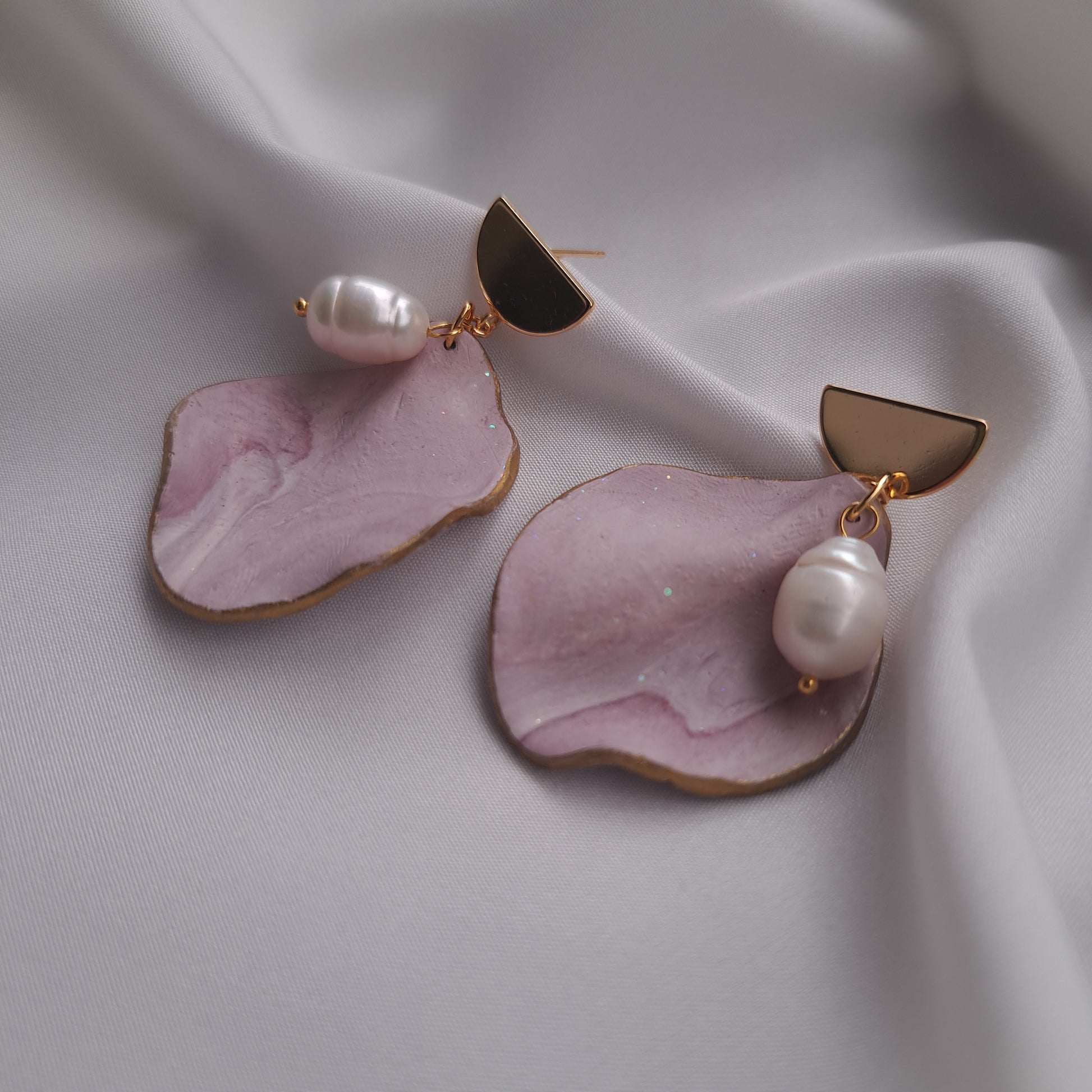 Orecchini eleganti e delicati, ispirati alla leggerezza di un petalo mosso dal vento. La base placcata in oro 24k accoglie una perla d’acqua dolce naturale, che incontra la morbidezza del petalo in pasta polimerica color rosa cipria, rifinito a mano con un bordo dorato.