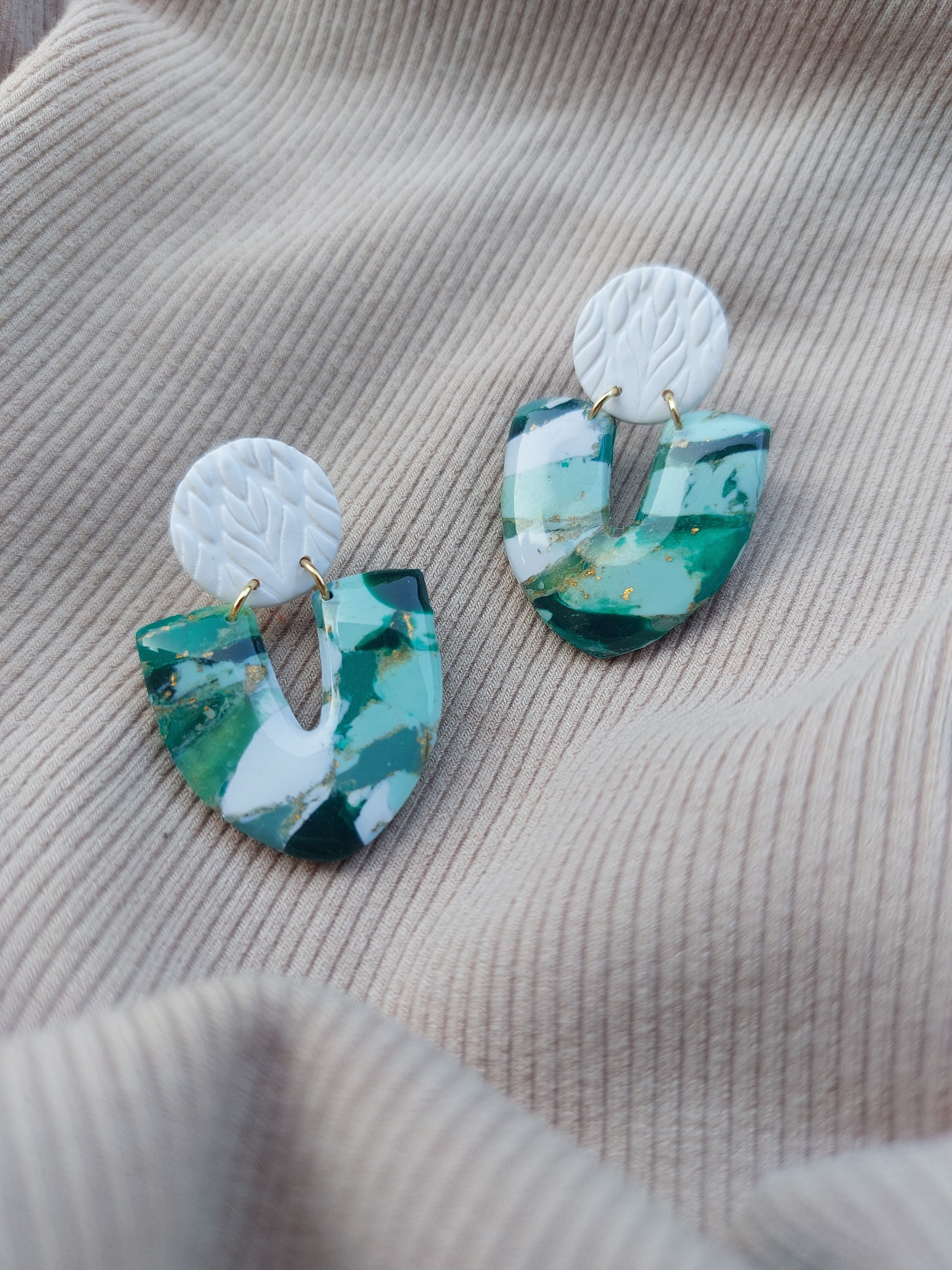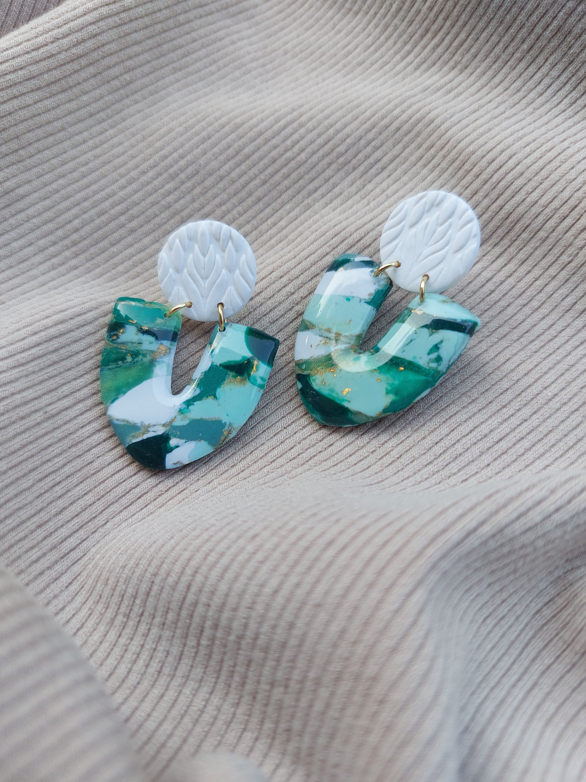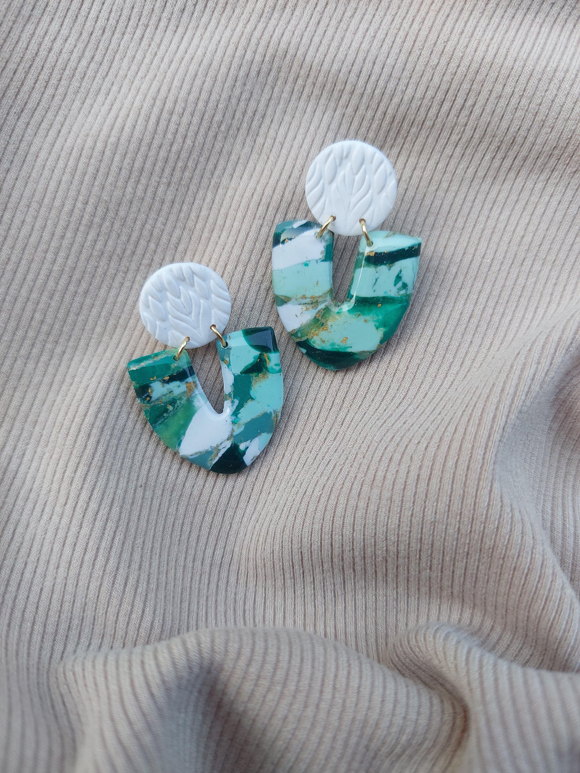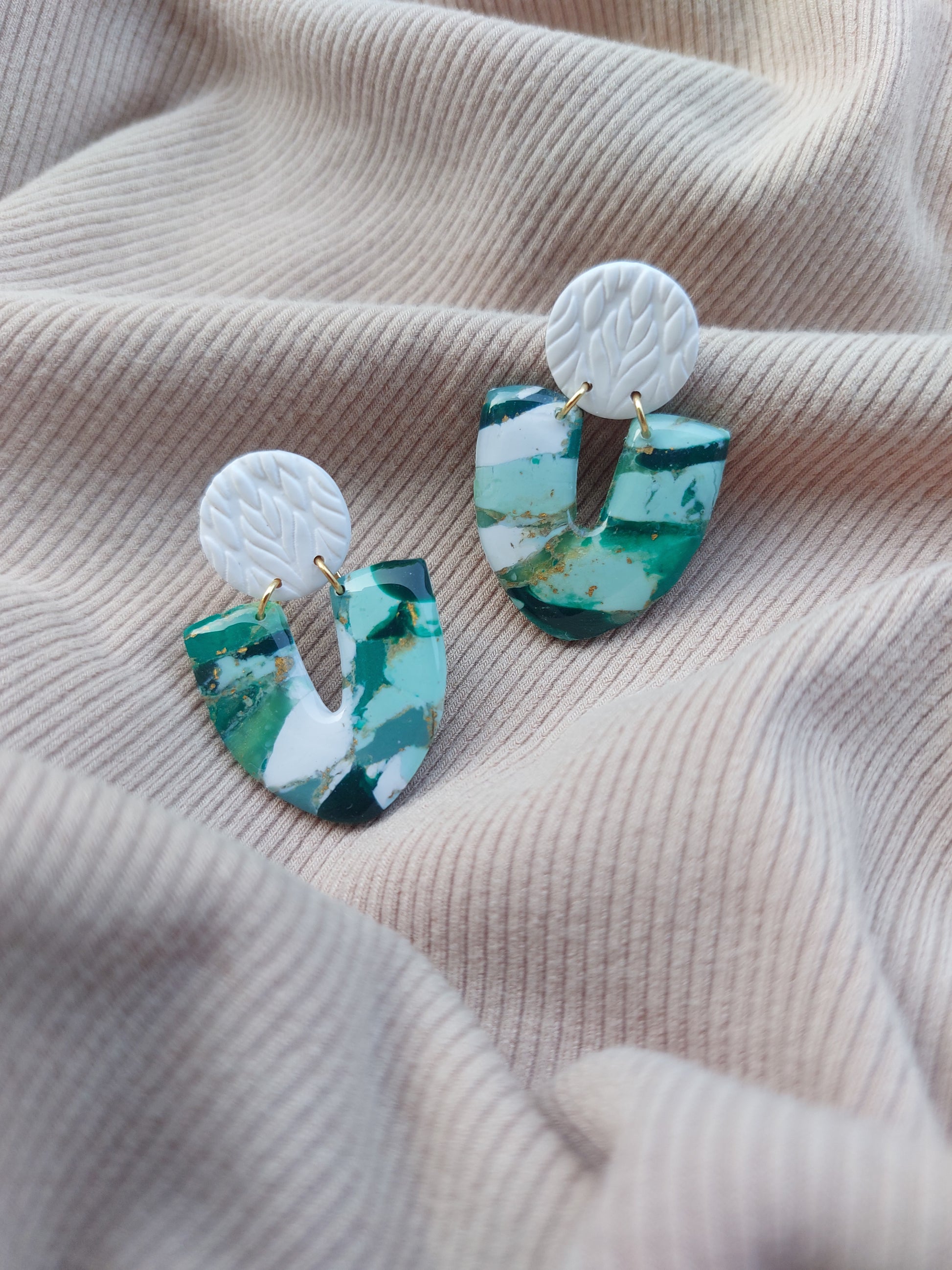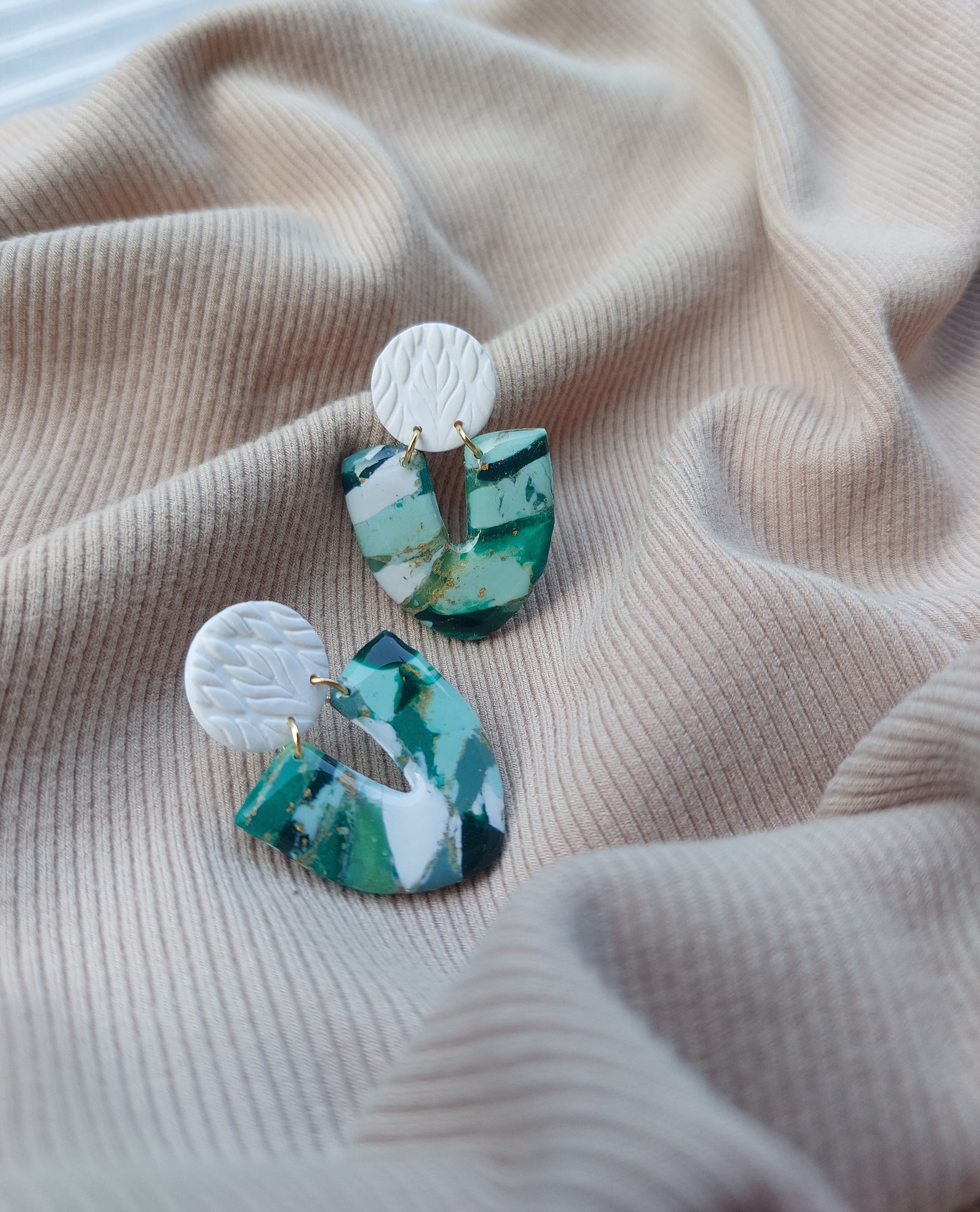 Orecchini artigianali dal design organico e moderno, composti da un cerchio superiore in argilla bianca con texture effetto foglia e una sezione inferiore a mezzaluna in tonalità di verde smeraldo, giada e accenti dorati. La combinazione evoca la forza calma della natura e il contrasto tra luce e foresta. Perfetti per chi ama accessori eleganti ma distintivi.