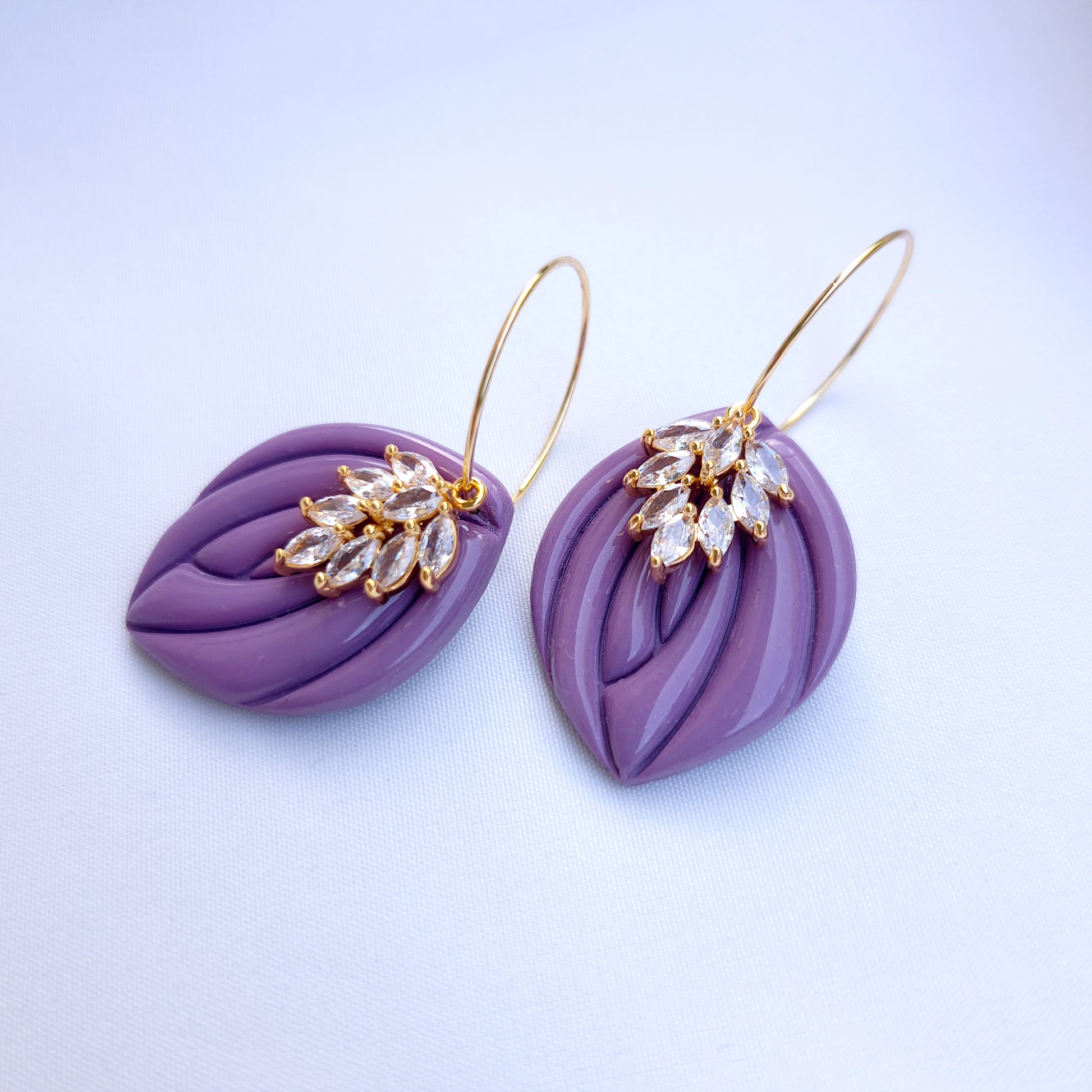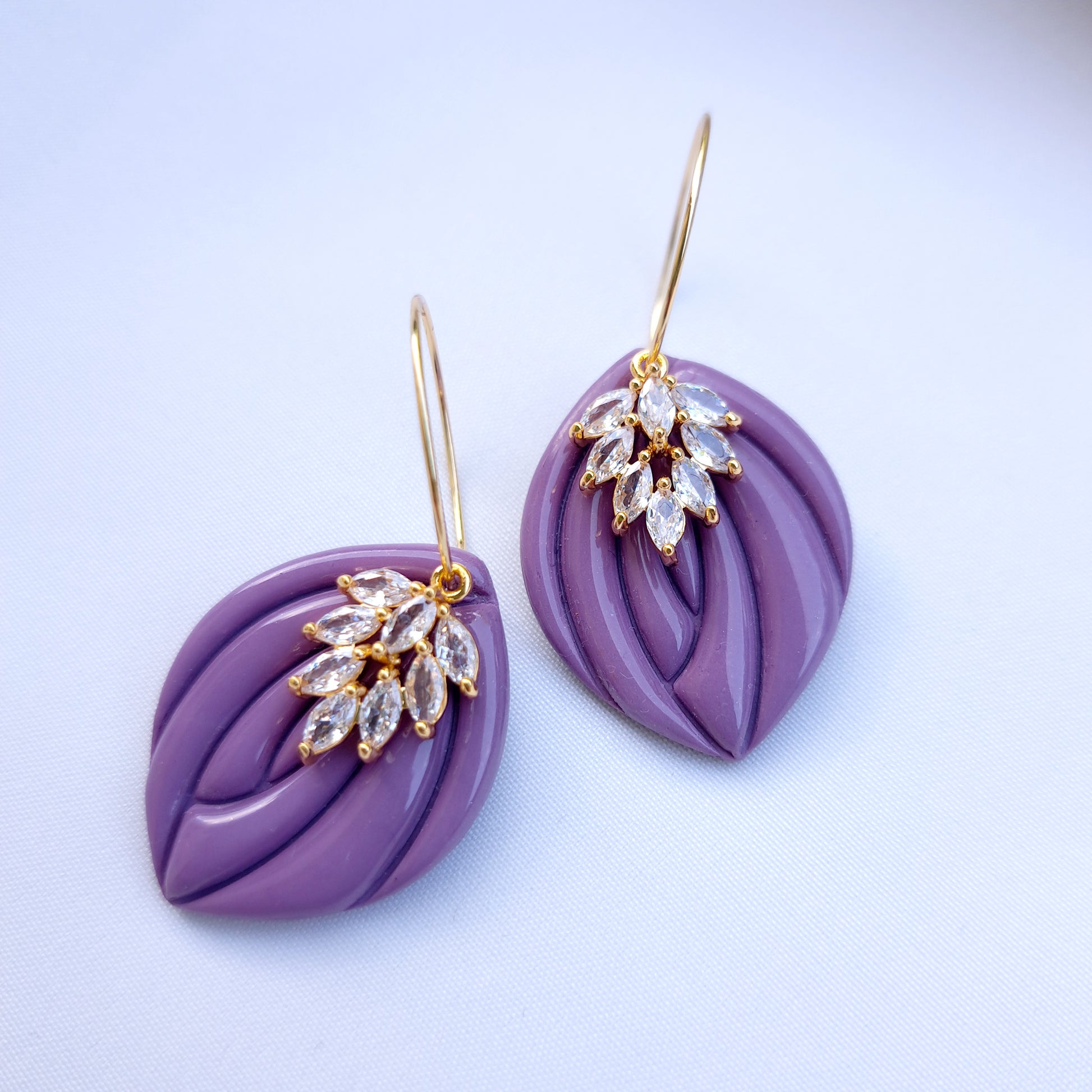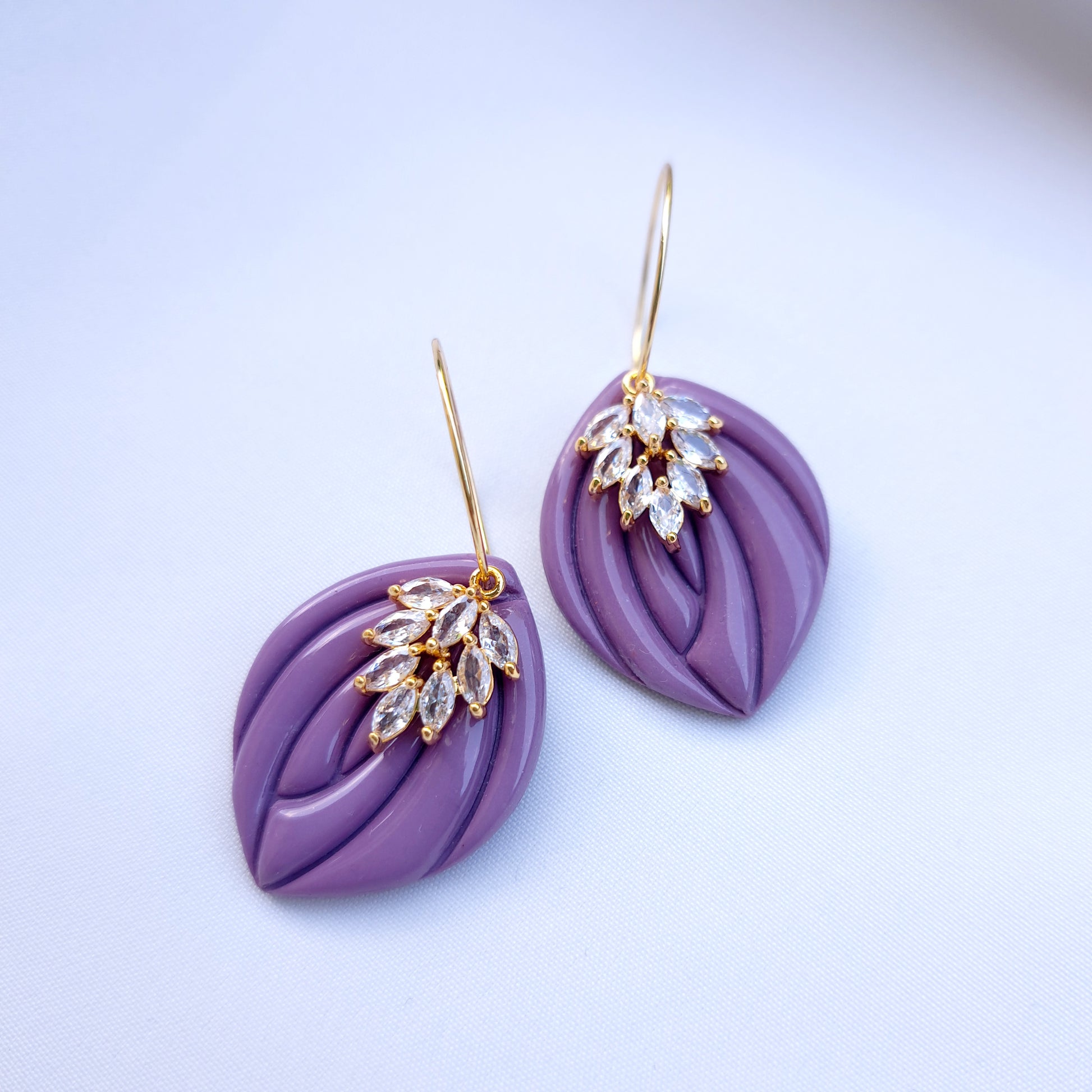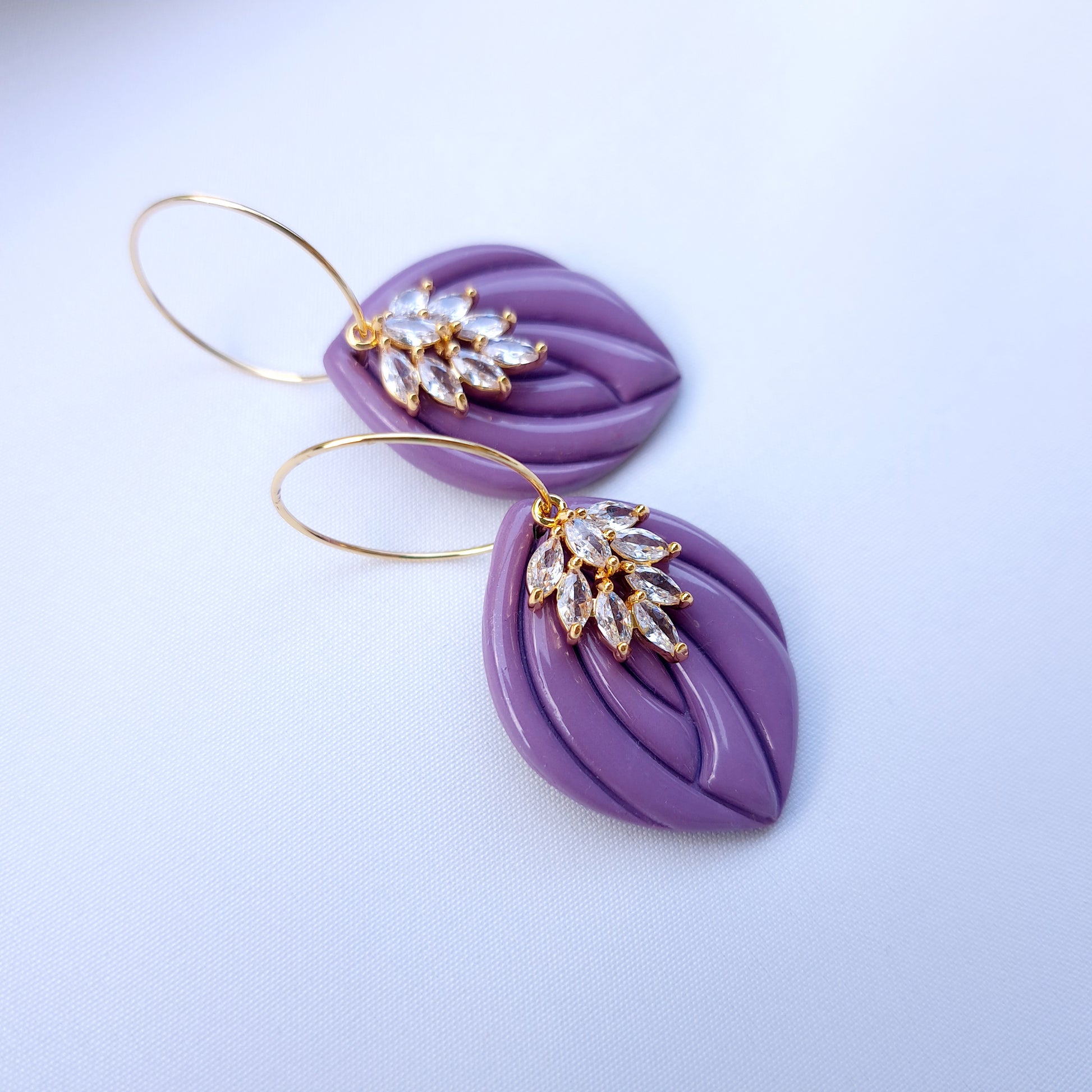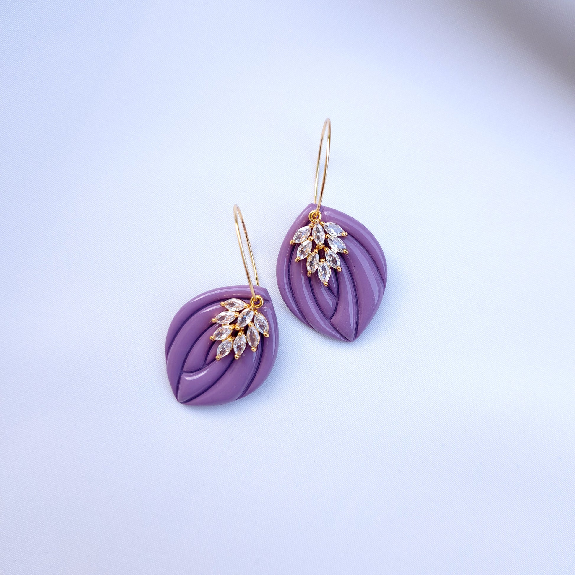 Eleganti e raffinati, gli orecchini sono realizzati a mano in pasta polimerica con un’intensa tonalità lilla, rifinita con una lucida copertura in resina che ne esalta le sfumature. La forma richiama una foglia stilizzata, arricchita da un ciondolo di zirconi marquise incastonati su base placcata oro 18k, che dona luce e preziosità al design. Un gioiello scenografico ma armonioso, perfetto per completare con personalità ogni look.