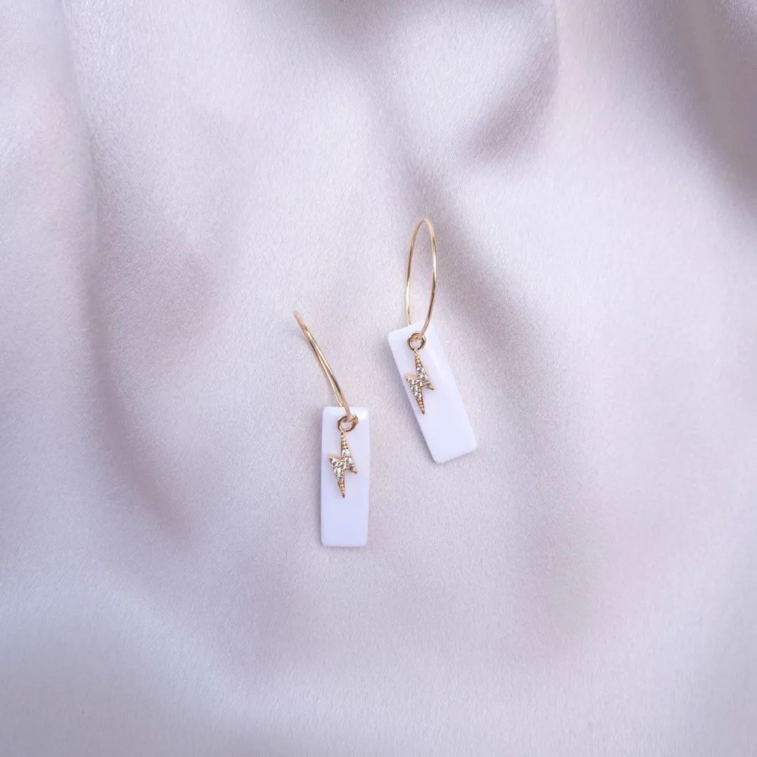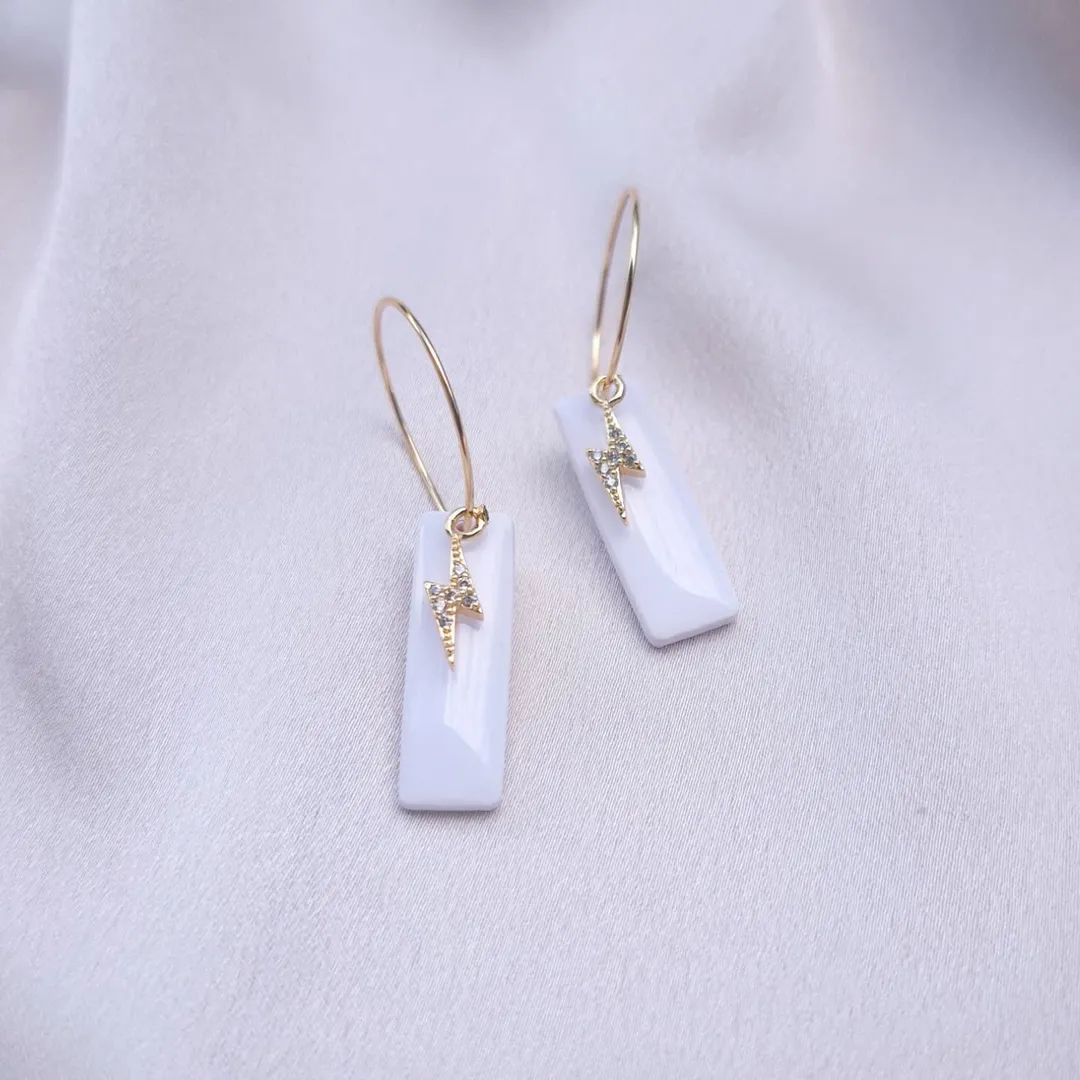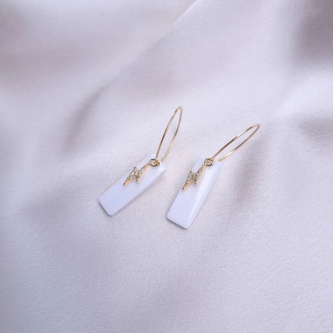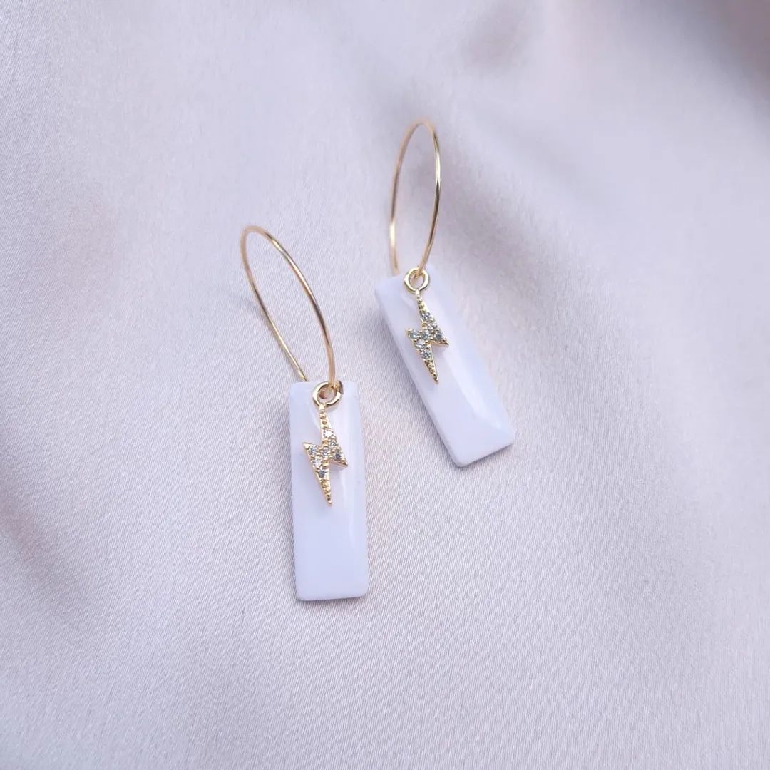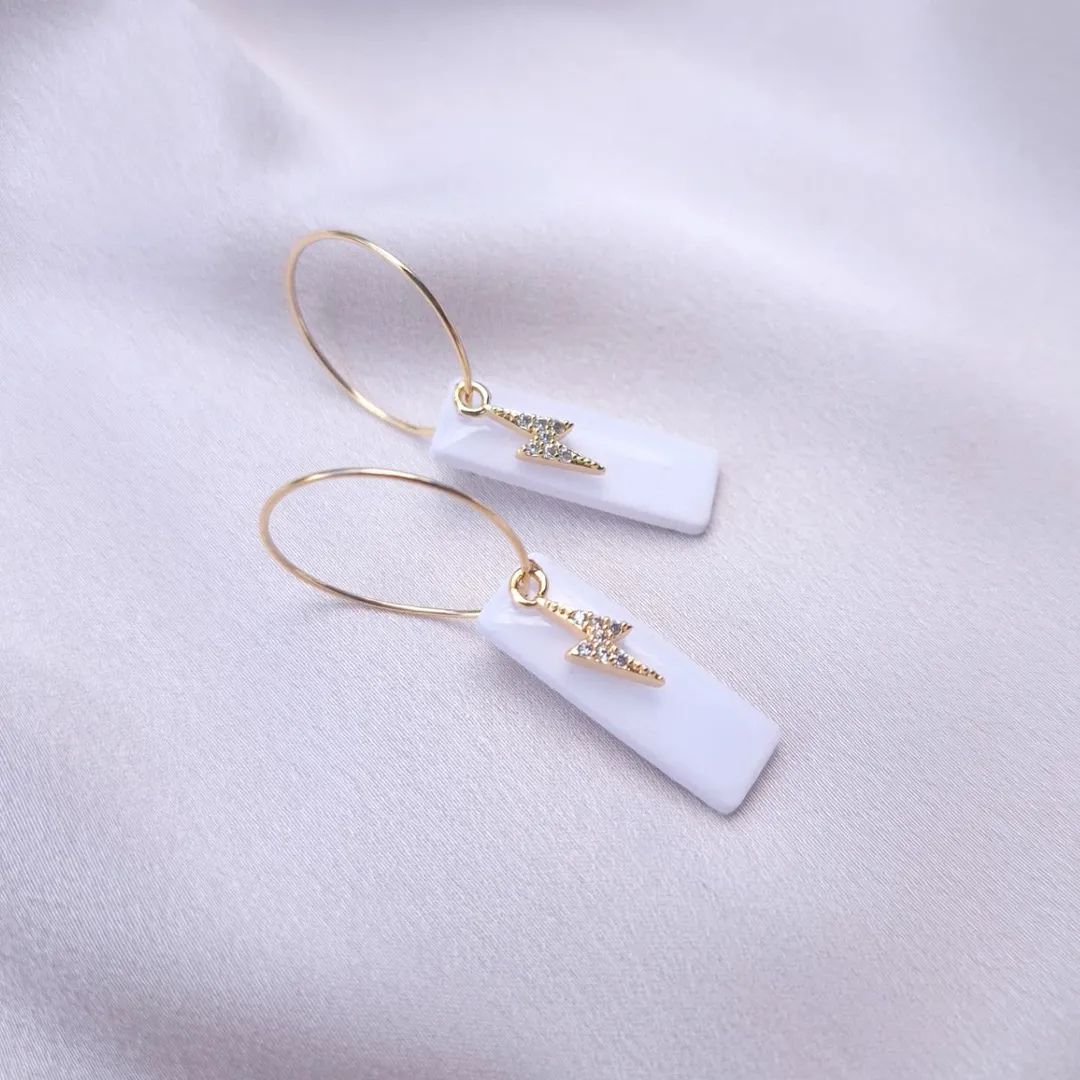 Orecchini dal design moderno e luminoso: cerchi placcati in oro 18 carati, con pendente rettangolare in pasta polimerica bianca, rifinito a mano con resina per un effetto vetro brillante.