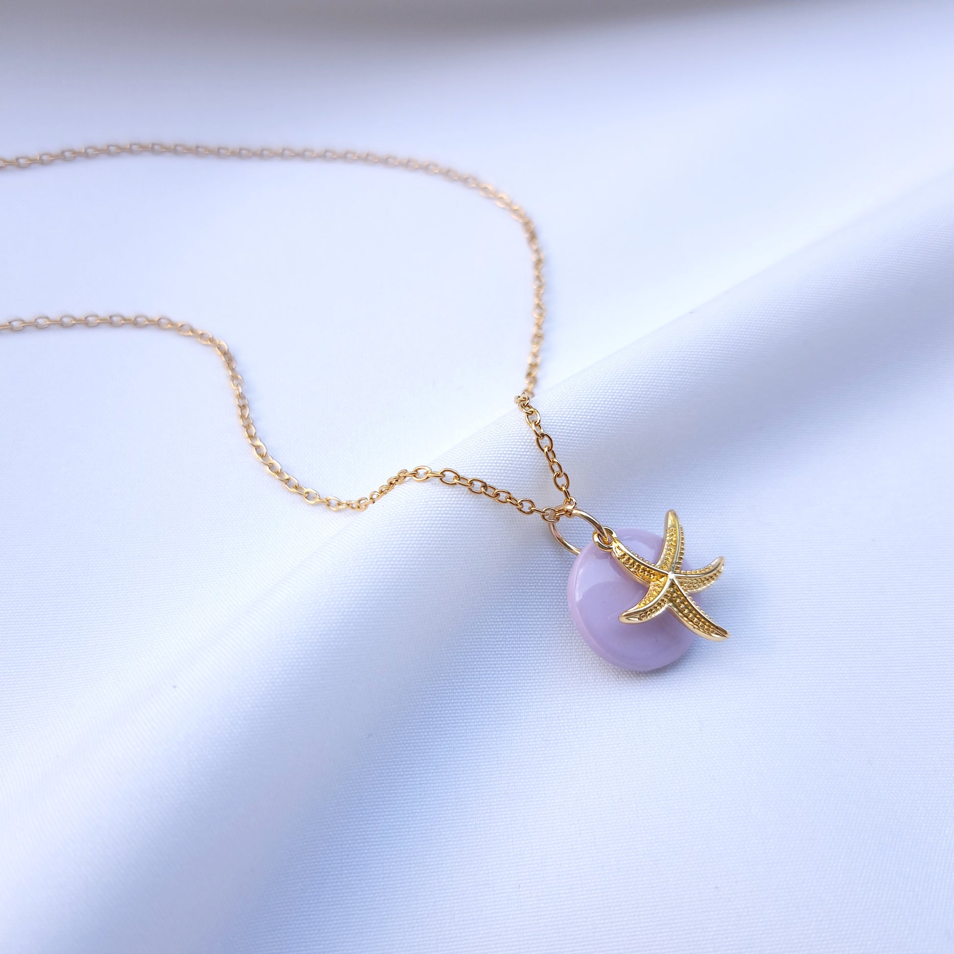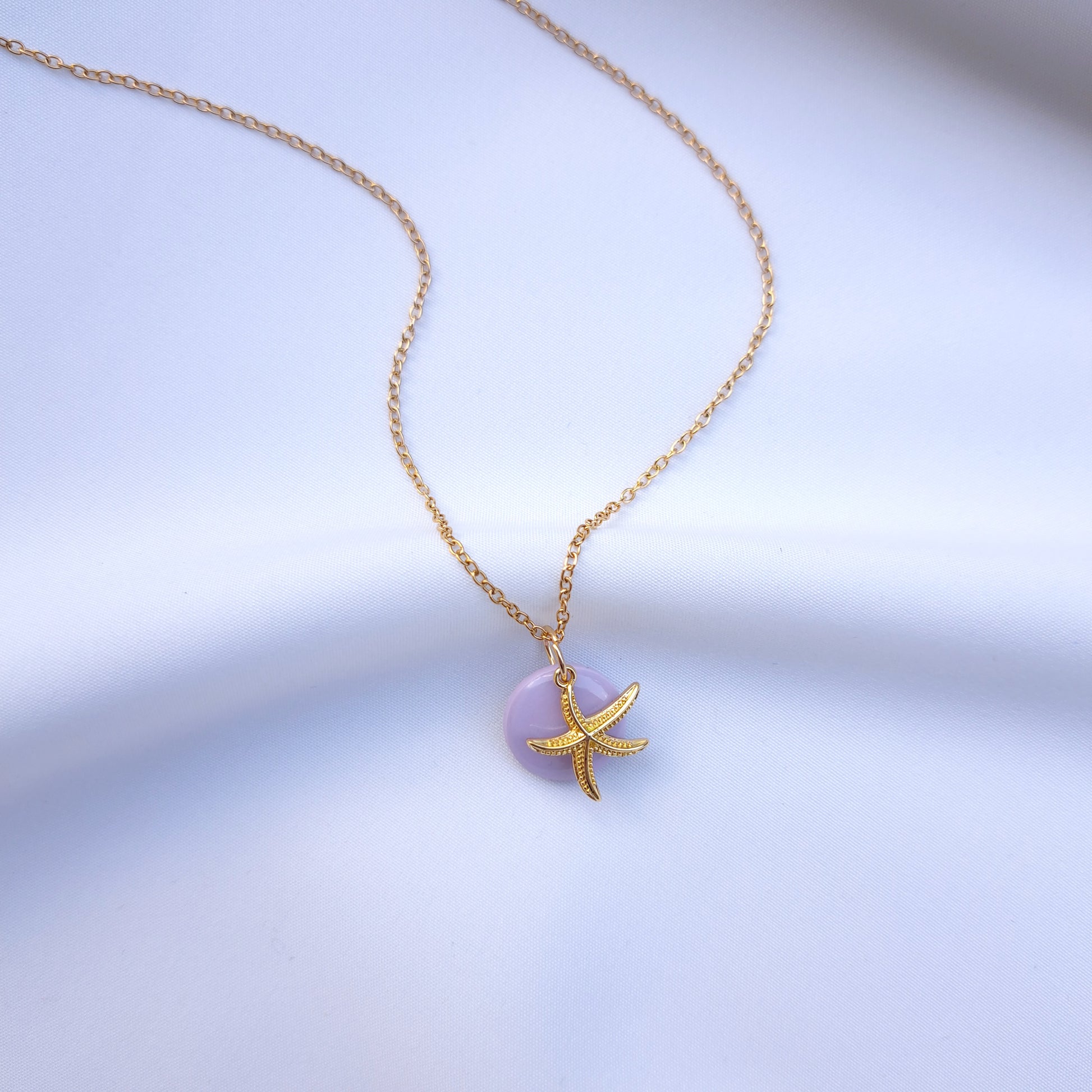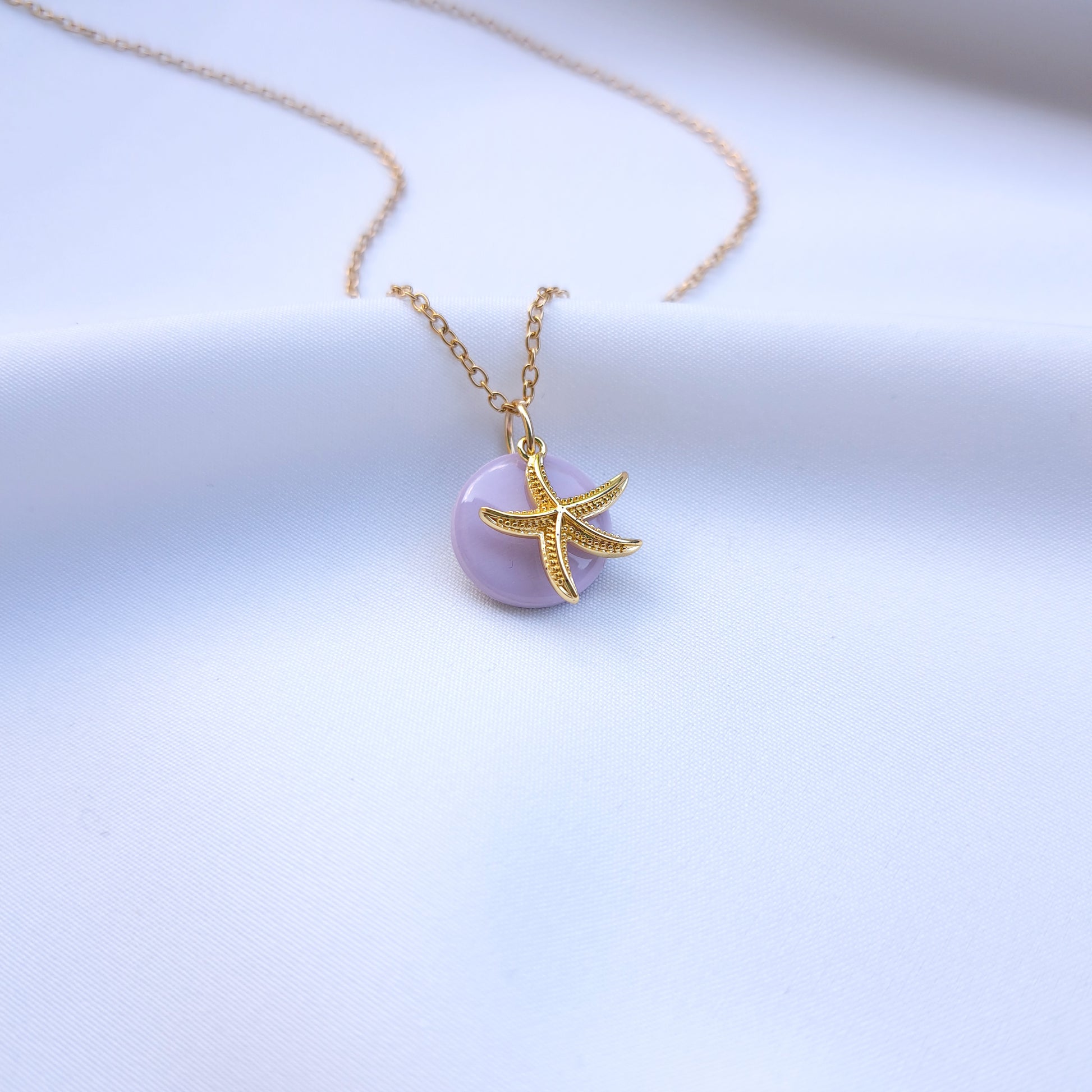 Il ciondolo è composto da una base in pasta polimerica color lilla, liscia e luminosa grazie alla finitura in resina, su cui si posa una delicata stella marina placcata in oro 18k.